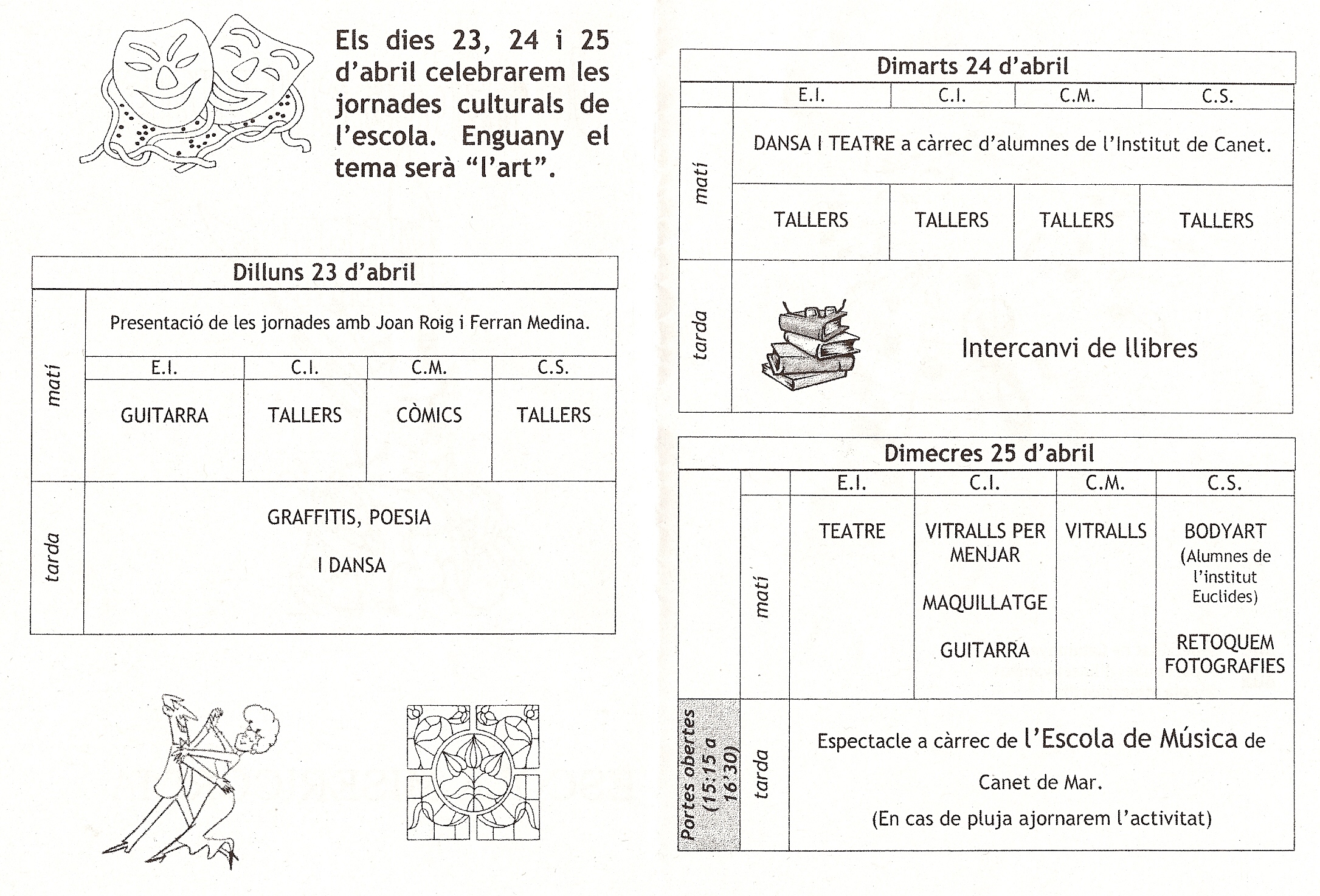 En aquests Jornades que començarem el dia 23 i duraran fins al dia 25 passaran per la nostra escola diferents artistes de diferents disciplines.