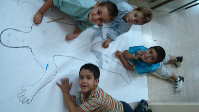 Som els nens i nenes de 1er, i us ensenyem unes fotos en les que ens podeu veure que bé ens ho em passat dibuixant el nostre cos i les seves parts.