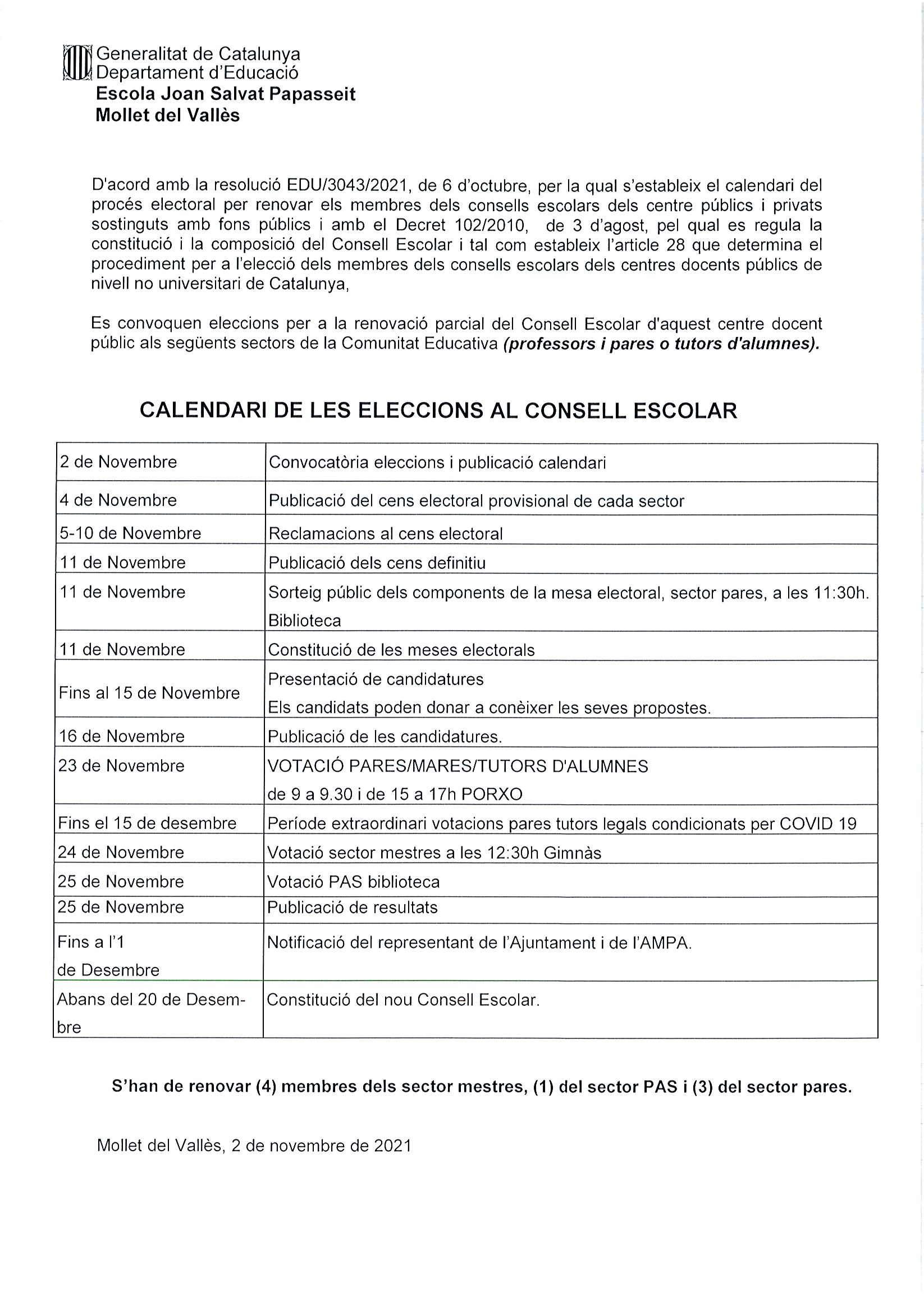 El 23 de Noviembre hay Elecciones al Consell Escolar secció familias.