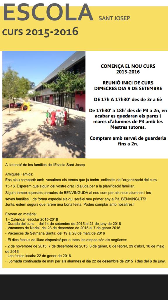 - El proper dimecres 7 de setembre us donarem la benvinguda al nou curs escolar. La reunió tindrà dos torns: