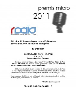 I, en la XXIVena edició, ha estimat oportú de guardonar la nostra escola amb un dels premis MICRO 2011.