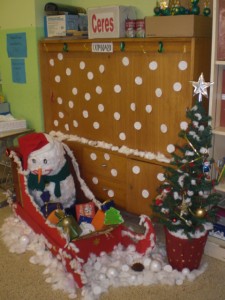 Fa tant de fred que el ninot de neu ha vingut en trineu a refugiar-se en una de les classes de 1r de la nostra escola.