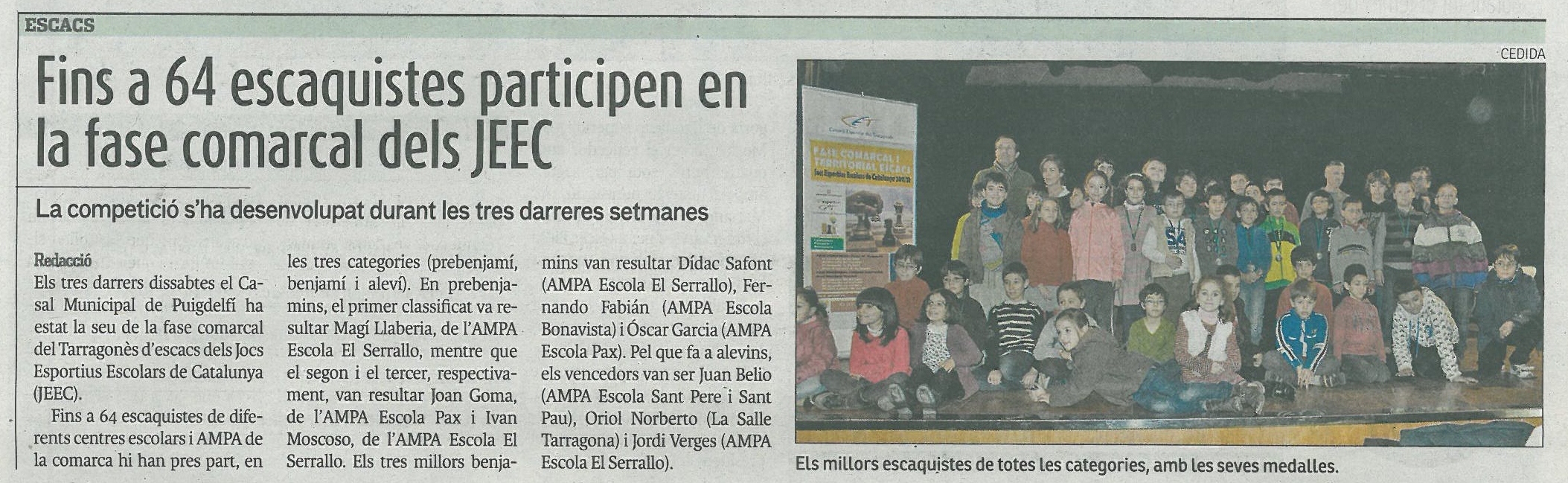 Demà, dijous, 16 de febrer, a Ràdio Sant Pere i Sant Pau, 101.0 FM, al programa Tarda a dos bandes, els alumnes de l’Escola Sant Pere i Sant Pau, en directe, a partir de les 7 de la tarda, a més d’explicar la seva experiència a la FLL, també parlaran sobre la Fase Comarcal d’Escacs del Tarragonès en què han estat participant, dintre dels Jocs Esportius Escolars de Catalunya, amb resultats que els han permès de passar a la Fase Territorial.