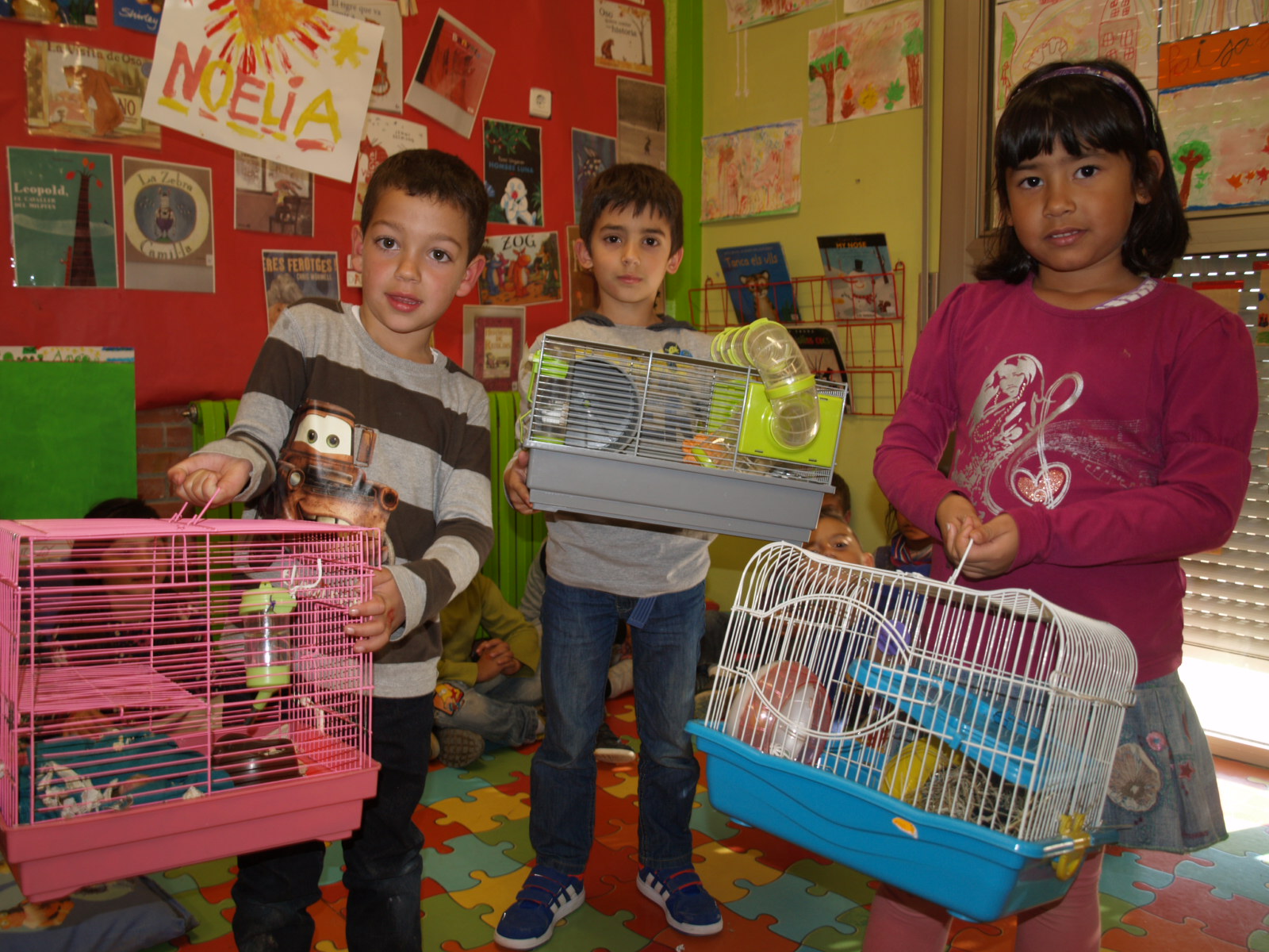 Tots tres ens han explicat curiositats tant de les gàbies com dels seus hàmsters. Hem pogut comprovar directament alguns aspectes treballats sobre els hàmsters: la cua, els ulls, com viuen, com es mouen… I els hem pogut tocar!!!