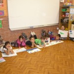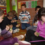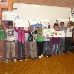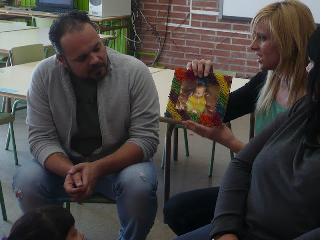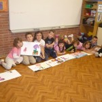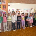 En primer lloc vam fer el bon dia amb els nostres fillols i filloles a la seva classe i els hi vam regalar el punt de llibre que havíem fet.