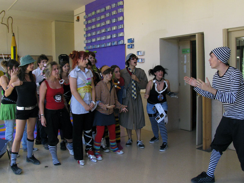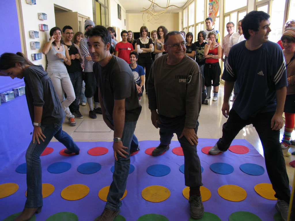 Es va fer un enorme joc del twister on professors i alumnes van jugar i s’ho van passar molt bé ./ There was a big “twister” game and teachers and students played and enjoyed the game a lot.