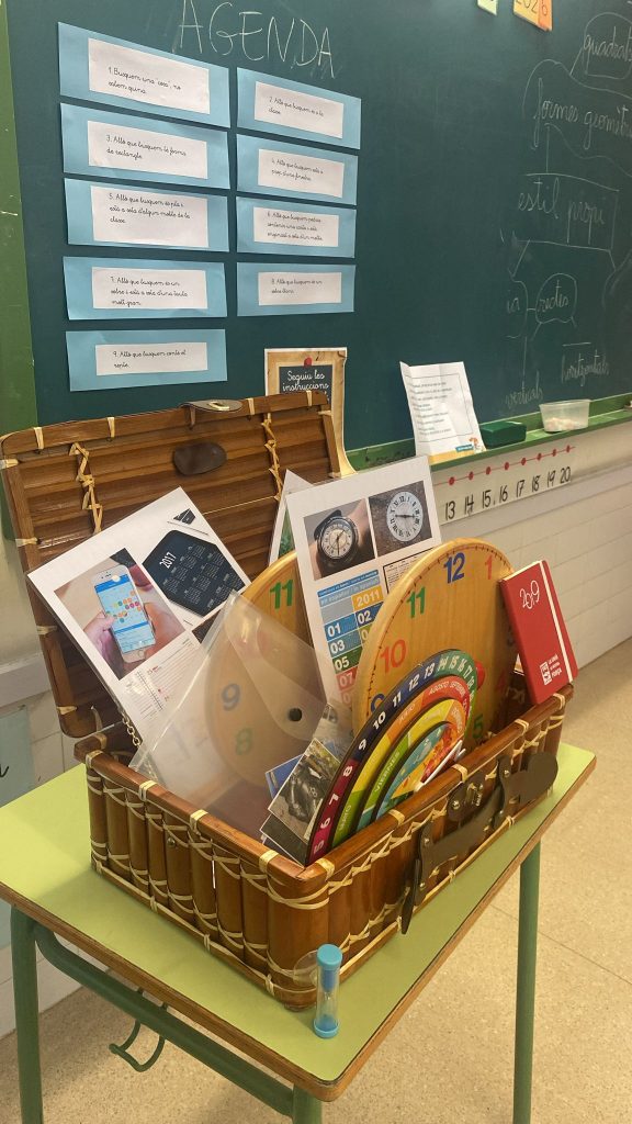 Avui ha arribat una capsa a la classe. Qui l’havia de portar no venia… se li ha fet tard! Quan l’hem obert hem trobat moltes coses: rellotges, agendes, calendaris… i tres sobres tancats. En un dels sobres es llegia: “OBRIU-LO ARA MATEIX”. Quan l’hem obert hem trobat un joc de pistes per trobar el repte del trimestre: “COM PODEM ORGANITZAR EL NOSTRE TEMPS?