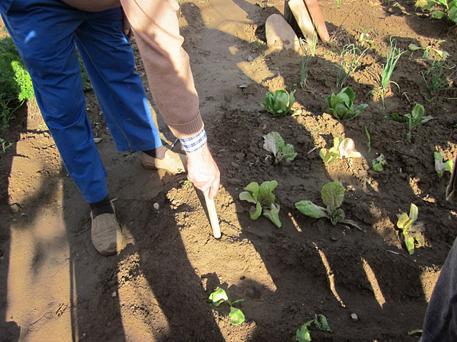 Ens va ensenyar a plantar una planta amb el punxó. Primer va fer un forat i després hi va posar la planta.