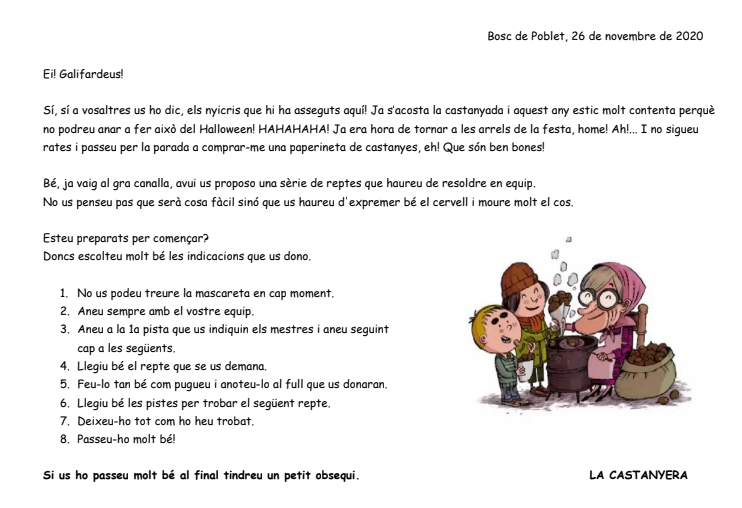 Aquest curs hem rebut una carta de la Castanyera que ens proposava una sèrie de reptes. Hem estat tota la tarda a fora als jardins resolent els reptes que ens ha proposat. Ens ho hem passat molt bé i al final hem rebut un obsequi de part seva.