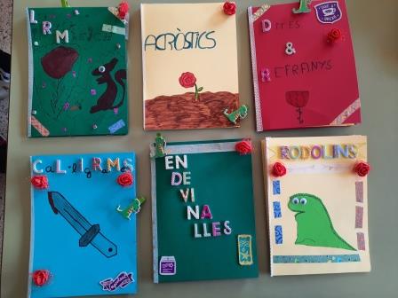 De bon matí vam començar elaborant uns llibrets per grups. Cada grup treballava un tipus de text diferent. Uns fèiem dites i refranys, uns altres cal·ligrames, altres acròstics, endevinalles, rodolins o pictogrames. També vam fer uns punts de llibre dibuixats per la Natàlia una de les nostres mestres.