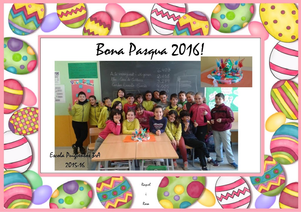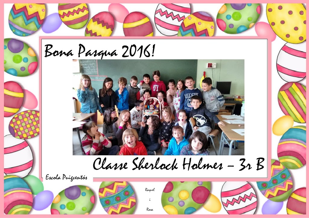 L’alumnat de tercer hem fet unes mones molt plàstiques per celebrar que ens n’anem de vacances. Hem treballat en grup i amb materials quotidians per fer una mona de pasqua que representi a cadascuna de les classes. Per poder compartir-les amb tots vosaltres us ensenyem les fotografies que ens hem fet amb elles tant la classe dels Barrufets com la dels Scherlocks.