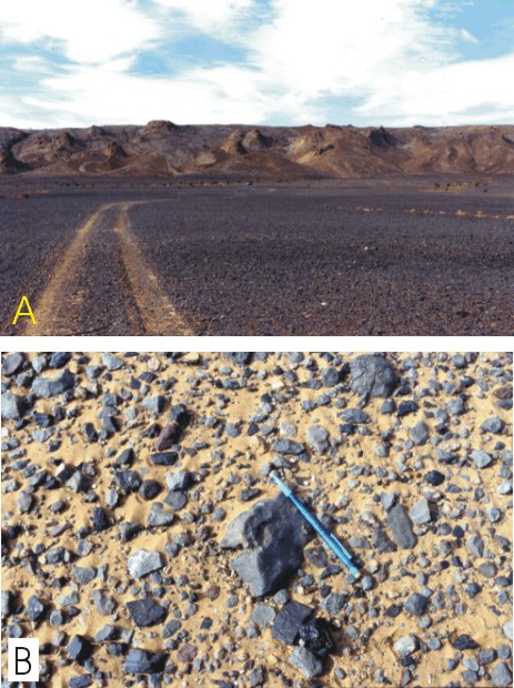 Els uadi només transporten llims, sorres i graves, però en les grans crescudes desplacen fragments de roques de gran tamany. L’erosió de les aigües és, bàsicament, lateral, amb molt poca incidència de l’erosió lineal. L’aigua difosa pot cobrir els vessants que s’estenen al peu de les muntanyes amb una fina pel·lícula d’aigua carregada de materials, on la disposició de les pedres i de la vegetació originen la formació de fils de corrent.