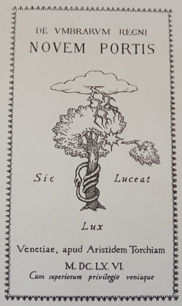 Mentre es fullegen les pàgines podem veure una frase en llatí a la qual li falten lletres i que els actors llegeixen així: “silentium est aurum”. També entreveiem el títol del capítol vuitè (“Porta octava arcani umbrarum regni”), de manera que podem deduir el títol original llatí de l’obra…