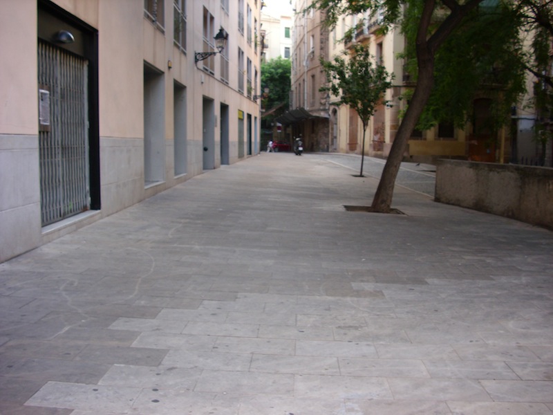 En aquesta fotografia es veu una cruïlla duna ciutat i als costats hi ha dos edificis molt grans que tenen moltes finestres. Al mig hi ha una rotonda on preserven un tros d’un edifici destruït. A la part de dalt hi ha molts cables, tant els del tramvia com els d’electricitat. Es veu una part del cel que no te núvols. La foto és en blanc i negre. La persona que ha fet aquesta foto ha fet un pla frontal i molt obert.