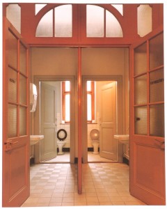 En aquesta fotografia podem veure dos lavabos simètrics, però hi ha algunes diferències. El lavabo de la dreta té la tapa de color blanc, i el de l’esquerra la té de color negre. El de l’esquerra té més llum i, d’altra banda, també té una màquina per eixugar-se les mans. Entre mig dels lavabos es veu una finestra vermella, dividida per una paret que els separa. Sembla que els dos lavabos es puguin comunicar, com si no hi hagués paret. El terra i les parets són de rajoles. Els colors principals són el blanc i el vermell.