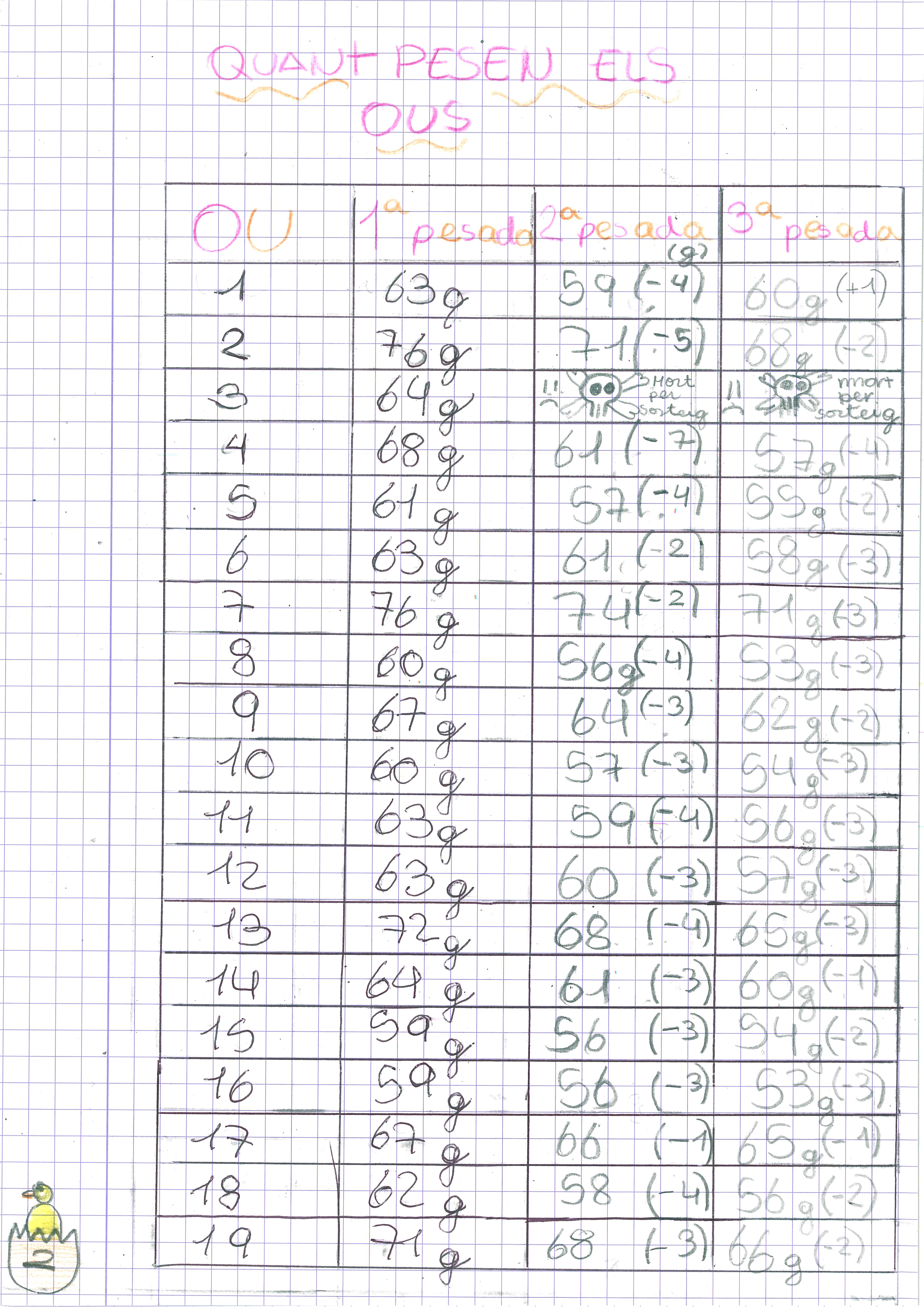 La 3a pesada ha anat molt bé! Tots els ous pesen menys que a la segona pesada, excepte el número 1 que pesa un gram més. No sabem què li passa però pot ser que sigui un error nostre a l’hora de pesar-lo.