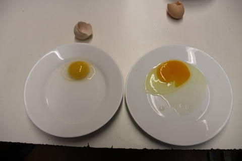 A l’interior hem vist moltes diferències: l’ou d’ànec té el rovell més gran i més compacte que el de gallina, per tant si volem fer una truita d’ous d’ànec ens costarà més batre’ls. També hem vist que la clara de l’ou de gallina era més compacte i amb més color que l’ou d’ànec, que la clara és molt més aigualida i transparent, per tant, s’escampa per tot el plat ràpidament. Encara hem vist una altra cosa, hem vist que la clara que “protegeix” el rovell (que acostuma a ser més dura que la resta de clara), hi ha un del dos ous que la té més gran, a veure si endevineu quin ou és… no tranquils ja ho dic jo: és l’ou de gallina, la té molt més gran que la de l’ànec 🙂 .