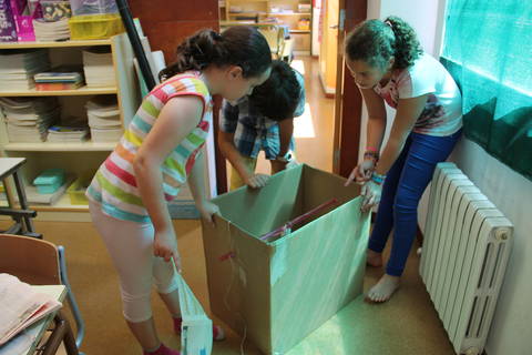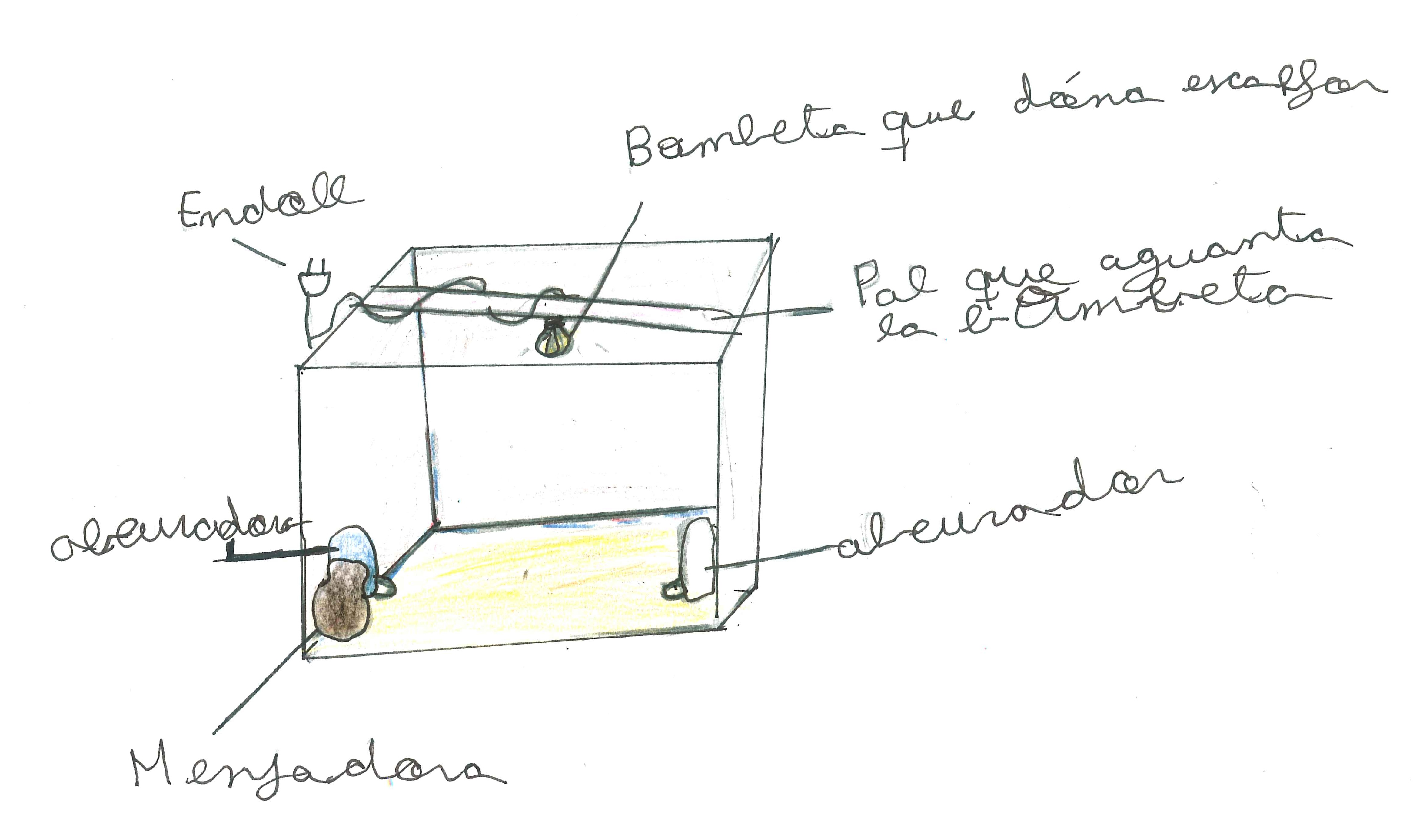 La casa és una caixa de cartró, al terra li hem posat serradures, té un pal que aguanta la bombeta que dóna escalfor als pollets, dos abeuradors i una menjadora.