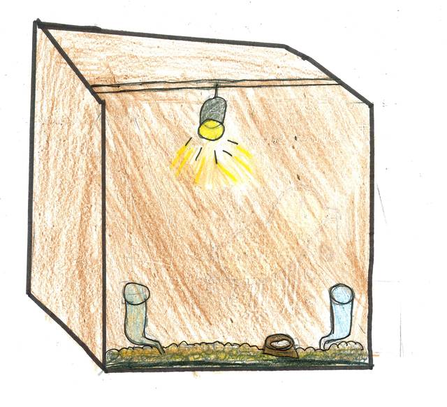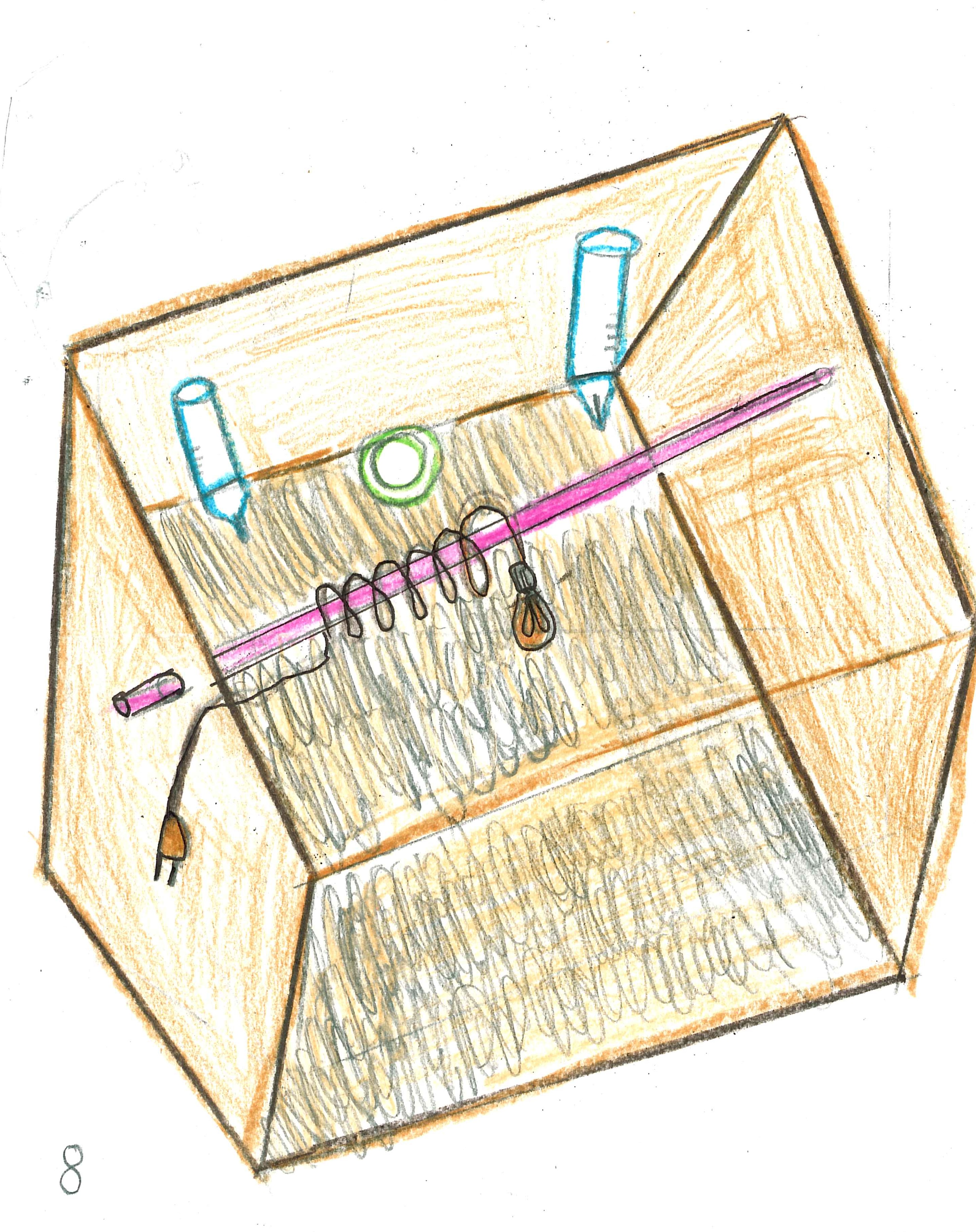 Quan els pollets neixin encara necessitaran escalfor durant uns quants dies però com que nosaltres no tenim una gallina lloca, hi hem col·locat una bombeta. Hem posat serradures a la base perquè quan els pollets facin pipi-caca no s’embruti la caixa.