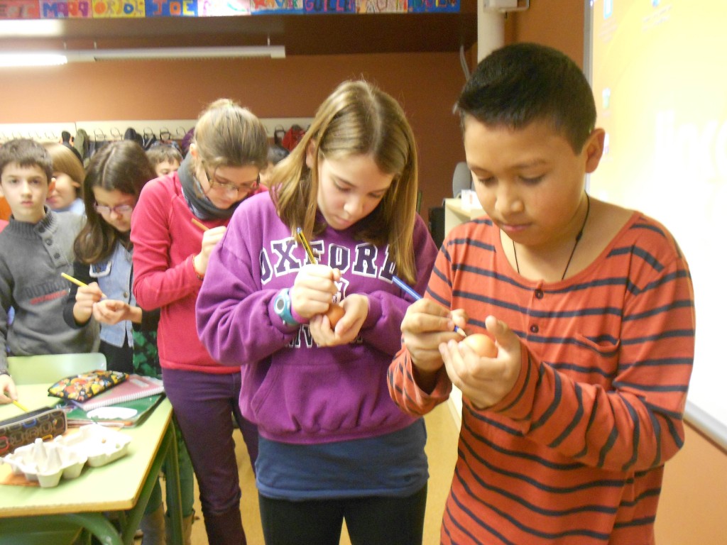 Aquest trimestre hem tingut una companyia animal, perquè a cinquè els mestres sempre porten ous d’una granja que coneixen. Els ous els posem en una incubadora on han de passar 21 dies; cada matí girem els ous per la cara on tenen dibuixat un sol i per la tarda els girem per la cara de la lluna (el sol i la lluna els hi dibuixem quan ens els porten). Vam tenir una avaria elèctrica que va afectar la incubadora durant més o menys un dia.