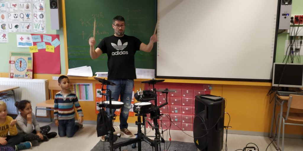 Avui, els nens i nenes de segon, hem escoltat una audició de bateria realitzada per en Gil, mestre de l’escola. D’aquesta manera s’ha fet una petita celebració de Santa Cecília, patrona de la música.