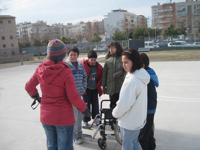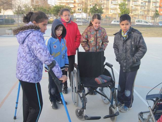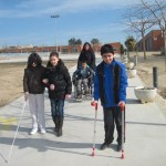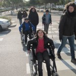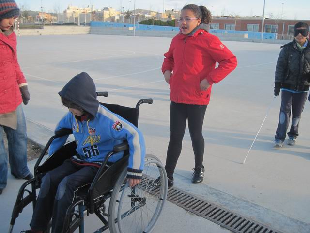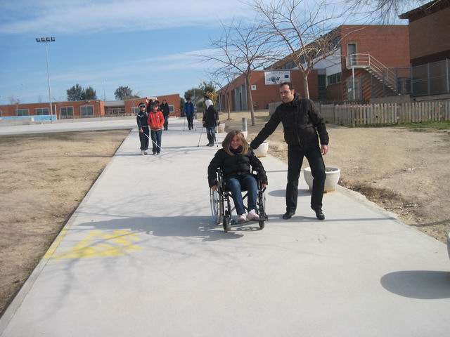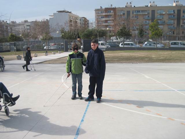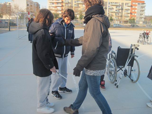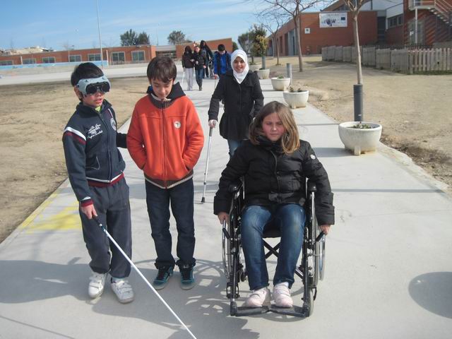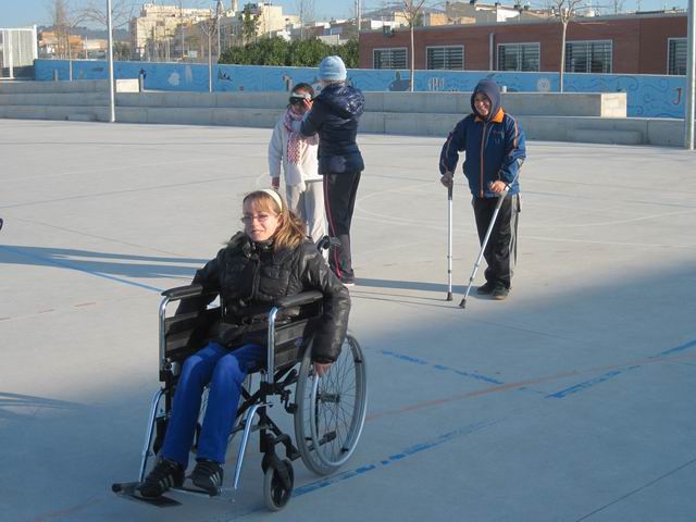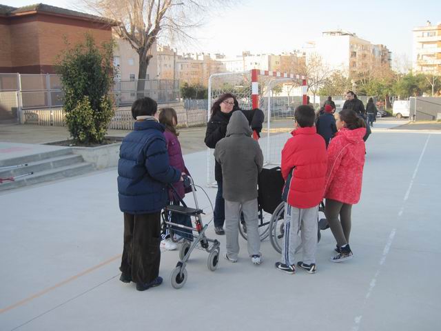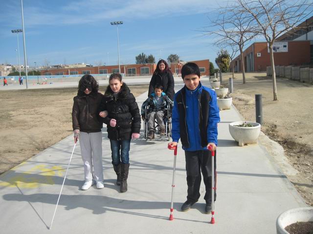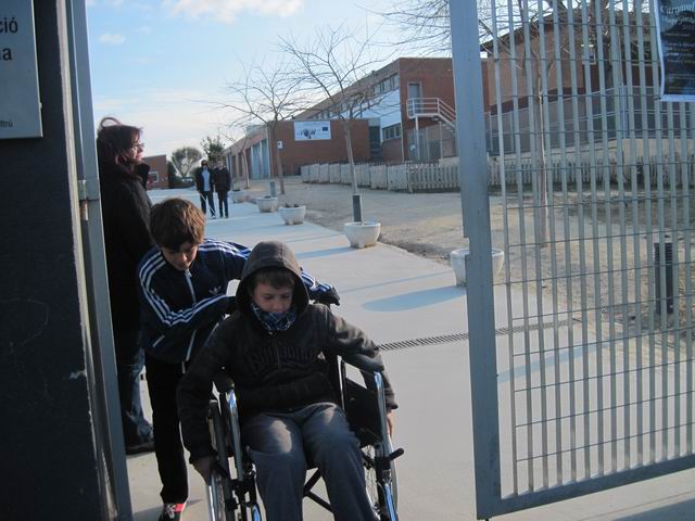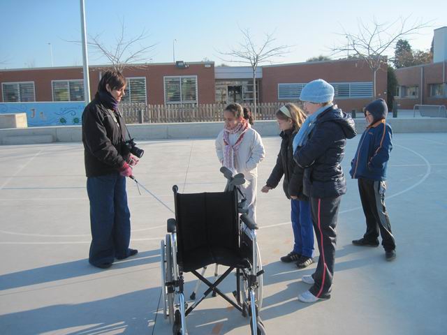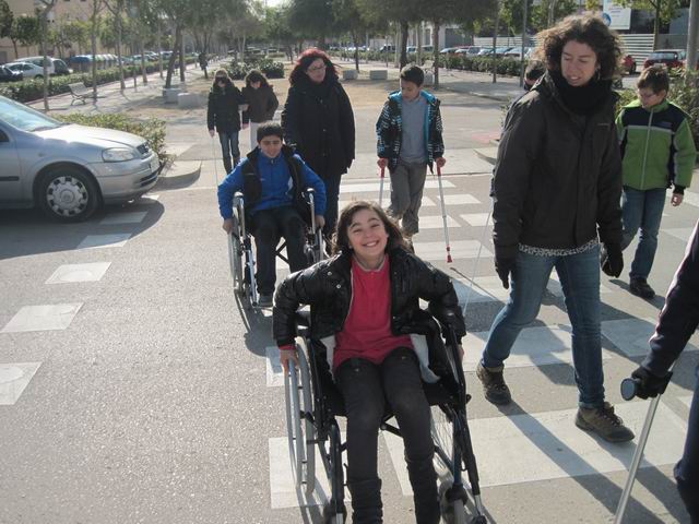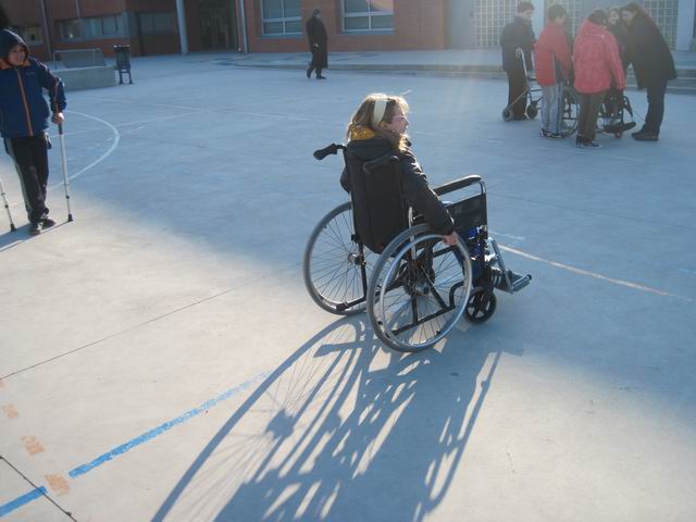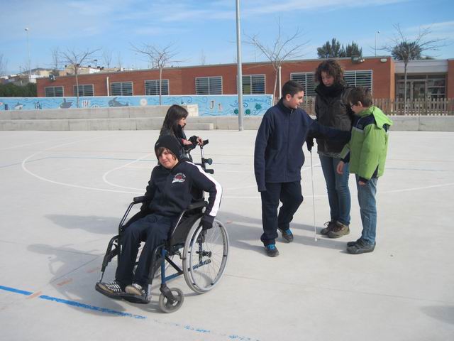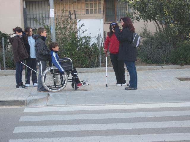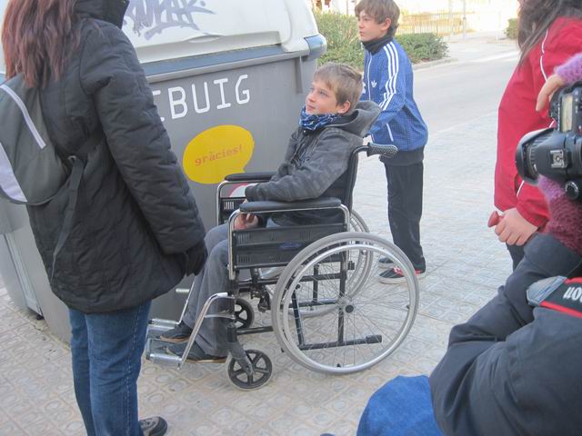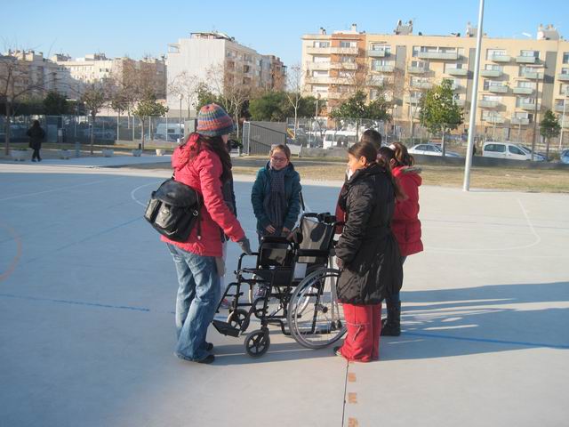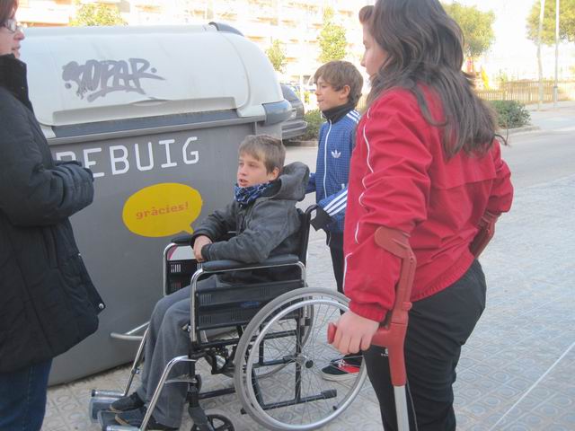 La part pràctica consistia en sortir al voltant de l’escola amb cadires de rodes, crosses, bastons de cec i caminadors per tal de poder prendre consciència del que significa viure amb dificultats d’accés i de relació diària amb l’entorn.