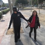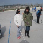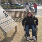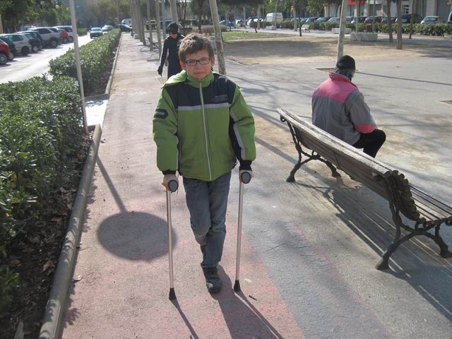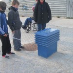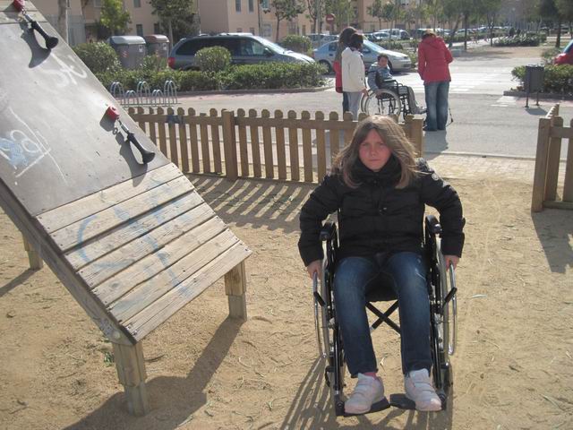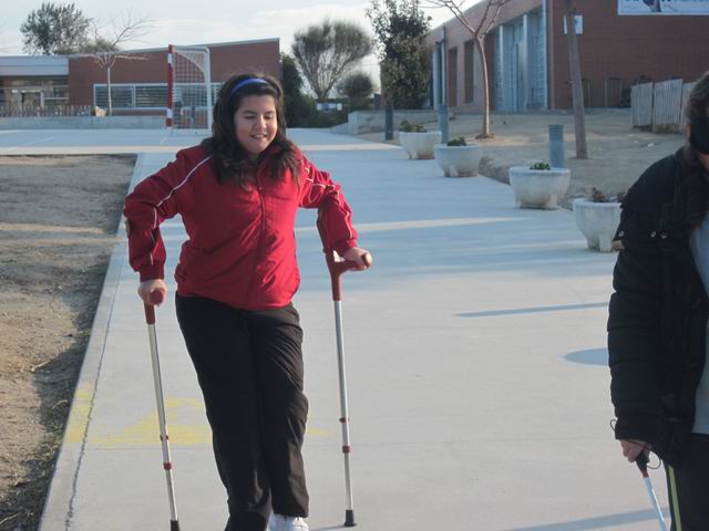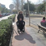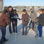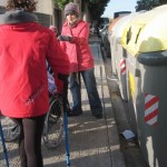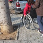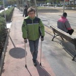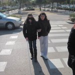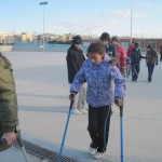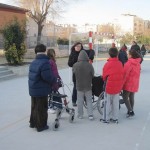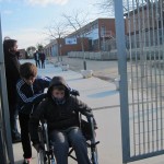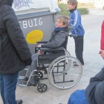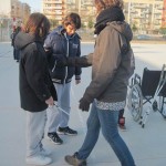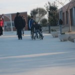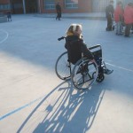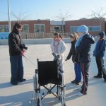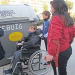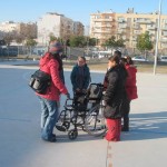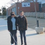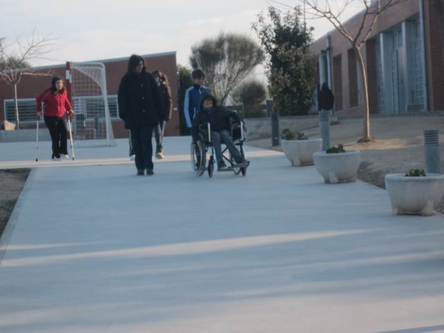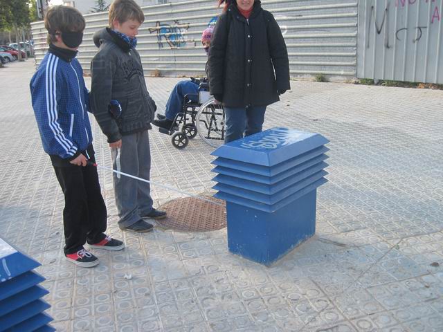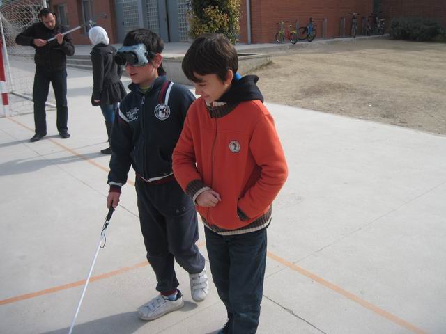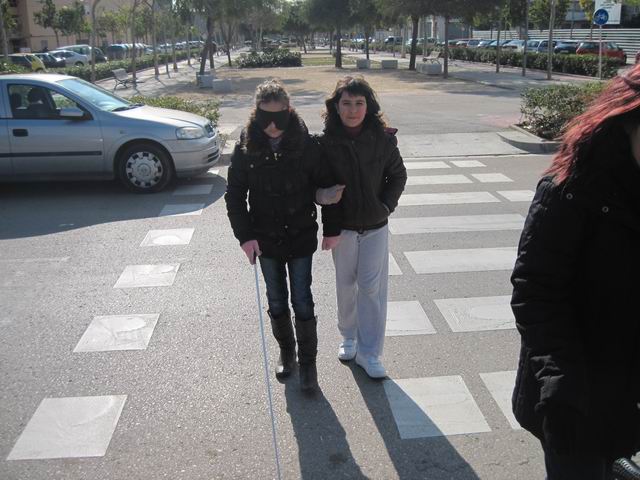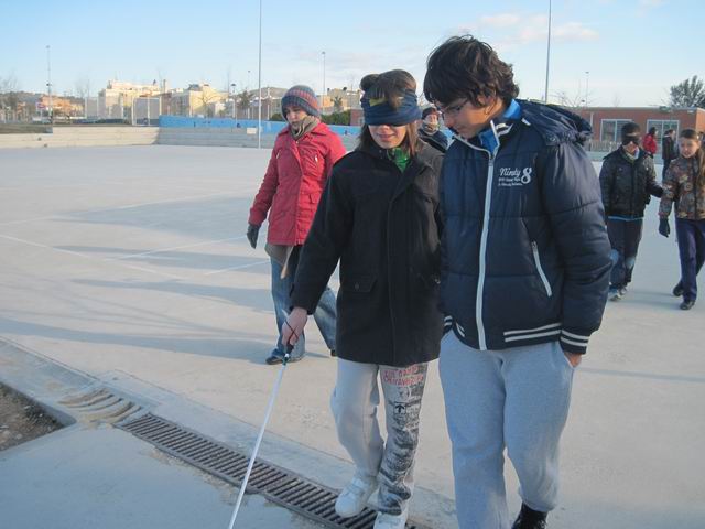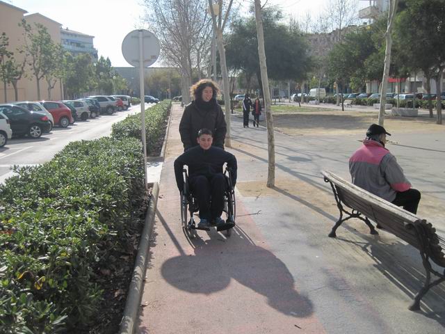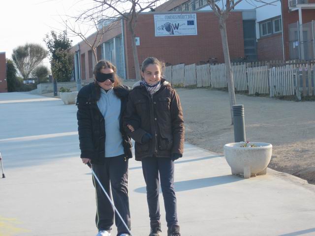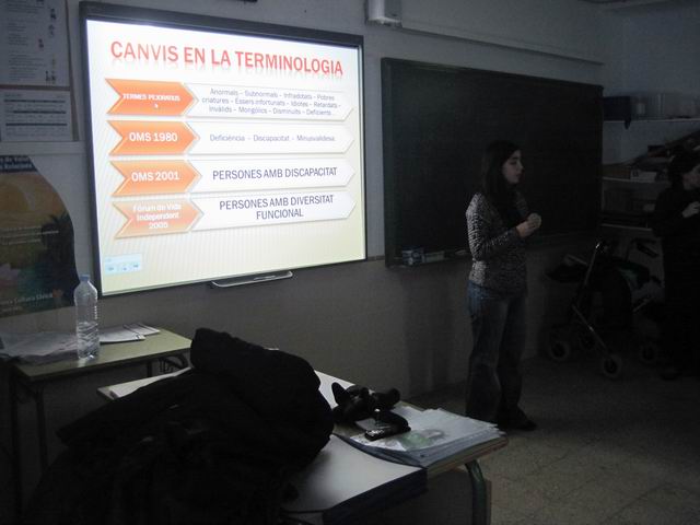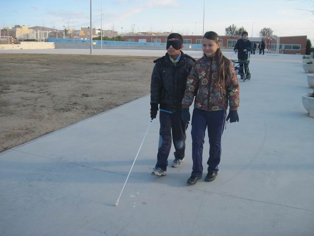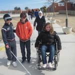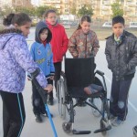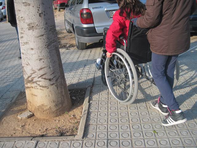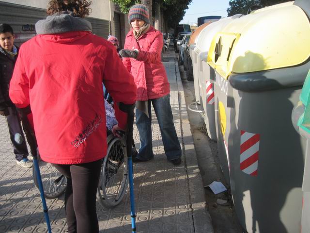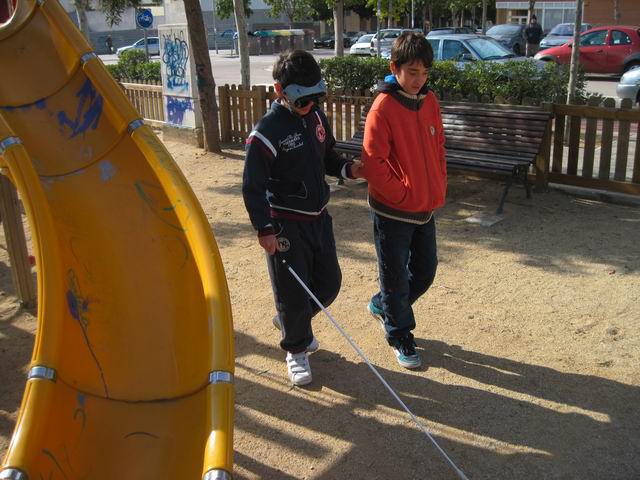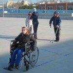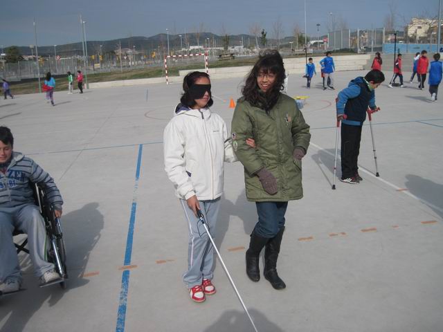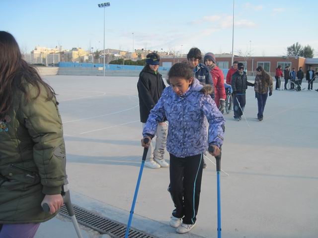 La part pràctica consistia en sortir al voltant de l’escola amb cadires de rodes, crosses, bastons de cec i caminadors per tal de poder prendre consciència del que significa viure amb dificultats d’accés i de relació diària amb l’entorn.