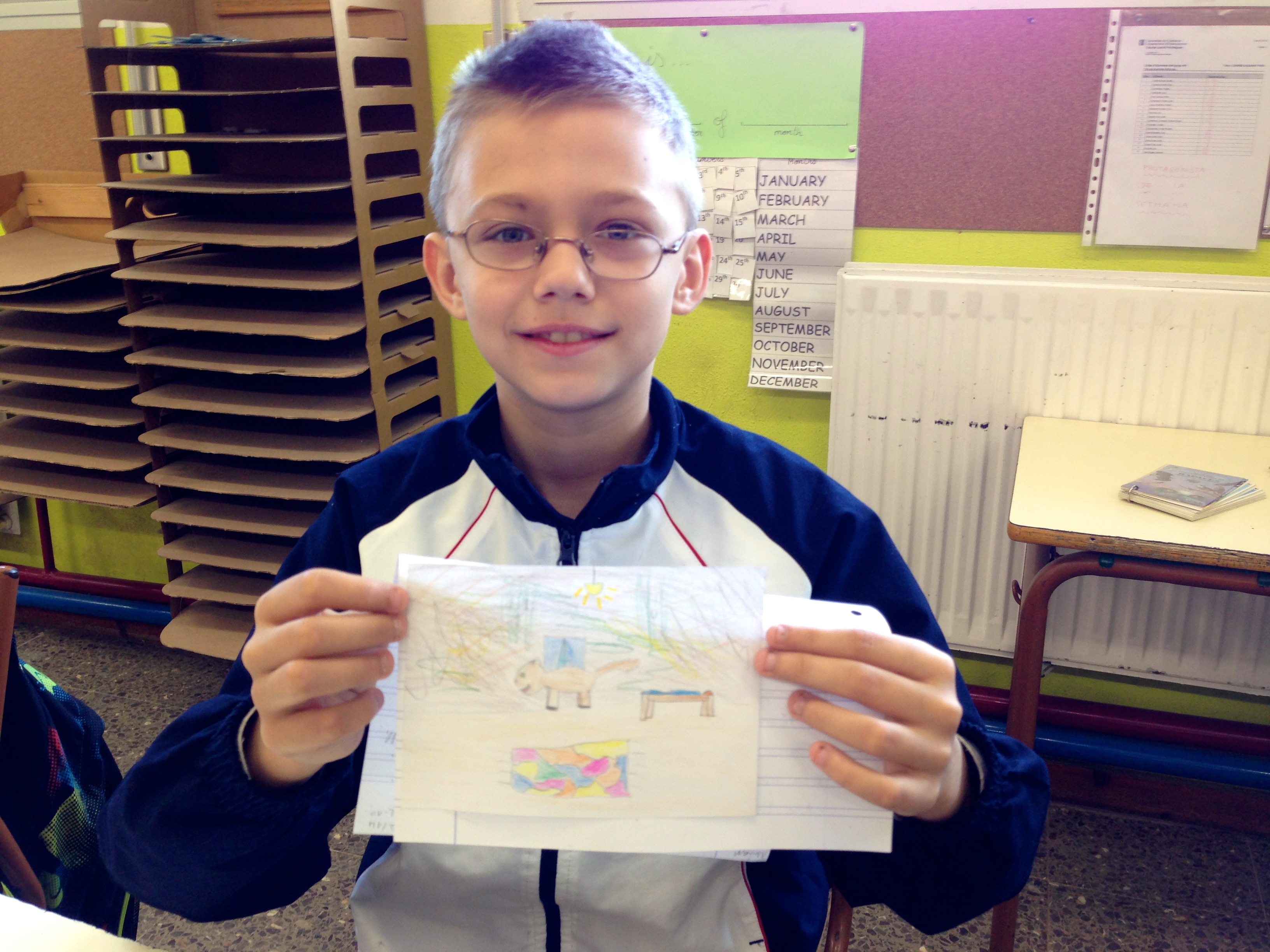 Un dia vaig trobar un animal, no sabia què era… es va acostar, tenia el cos d’un ós, potes de cavall, la cua gran d’un gos, orelles d’hàmster, cap petit i rodó i una boca vermella. Quan el vaig tocar, tenia una pell molt fina em semblava com de peluix. Quan el vaig portar a casa va mirar la meva habitació. Quan el meu gos va entrar a l’habitació es van mirar i després vam jugar una mica.