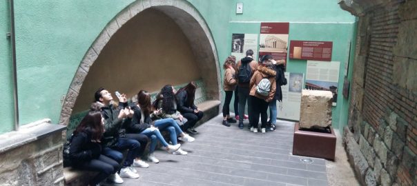 Des d’aquí, els alumnes van començar un recorregut que els va portar per diversos llocs relacionats amb Barcino: la necròpolis, l’aqüeducte romà, les torres romanes, les lletres de Joan Brossa on hi ha escrit BARCINO, el fòrum, el temple d’August, les muralles…