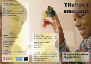 A través de l’actriu i titellaire Teia Moner, he sabut que ja està oberta la inscripció a la III Jornada Internacional d’Educació i Titelles que es realitzarà el dia 28 de juny 2012 al Campus Mundet de la Universitat de Barcelona.