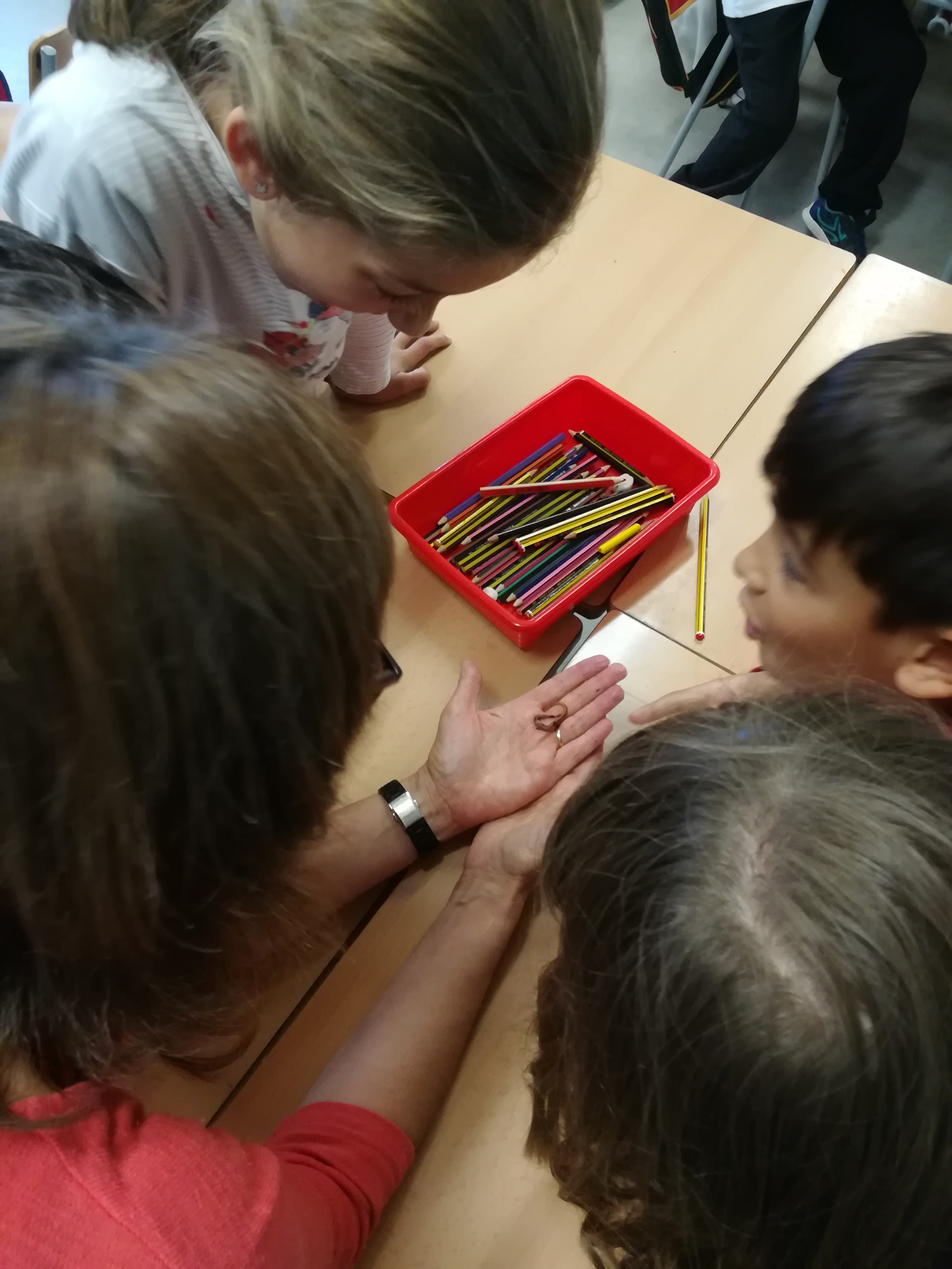 Els nens i nenes de 1r ens han regalat una rosa a cadascú per agraïr-nos que els hàgim llegit un conte.