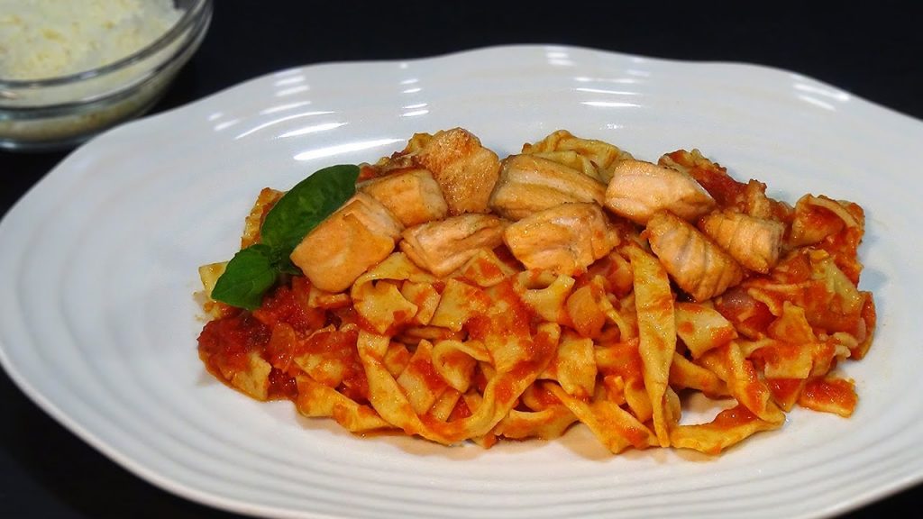 Después de  haber cocido el salmón y escurrido los tallarines, solo le falta la elaboración del plato. Eche los tallarines en dos platos separados (125 g por plato) y el salmón también (100 g por plato).