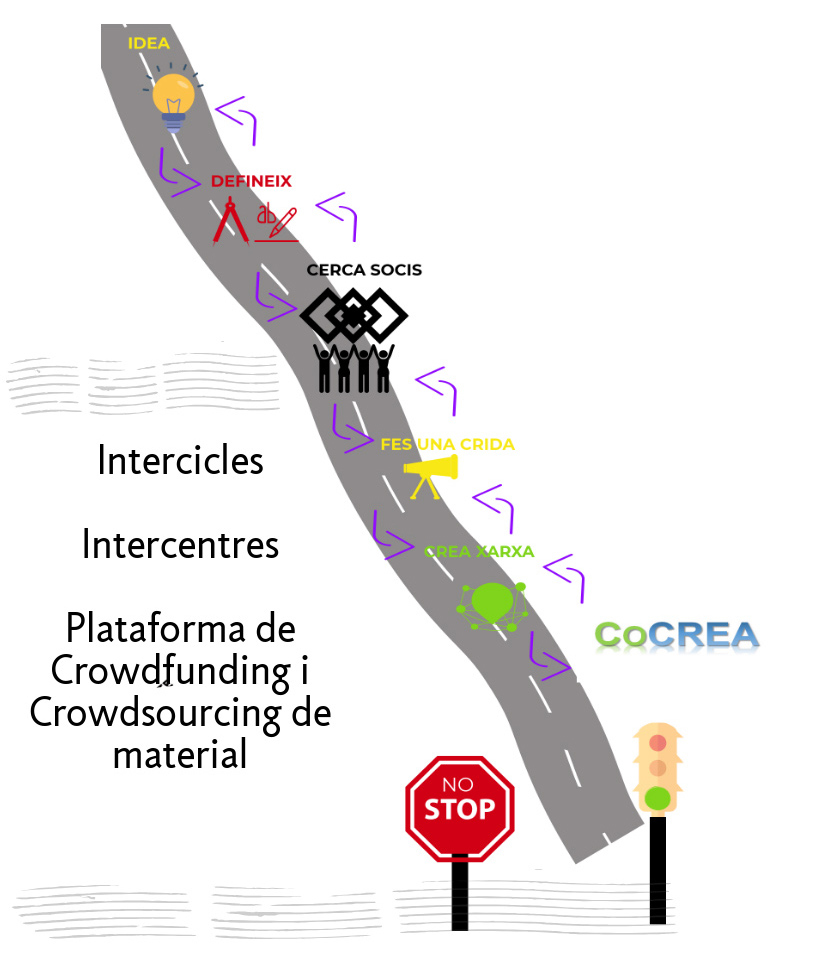 A continuació es resumeixen les etapes del projecte per als alumnes, en els que l’equip docent i tractor acaba formant part de l’equip liderat pels alumnes. La cocreació solidària s’ha demostrat que és una eina molt motivadora, que els alumnes exerciten amb il·lusió i motivació, i que permet treballar diferents aspectes del currículum des del vessant més pràctica, solidària i de vegades fins i tot lúdic i respectant els diferents ritmes de treball.