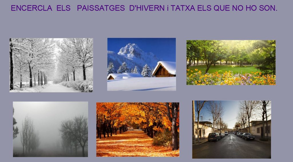 Activitat 2: Es presentaran a la pantalla digital diferents paisatges de l’hivern i els alumnes han de dir si són de l’hivern o no i raonar la resposta. L’activitat es farà amb tot el grup classe.
