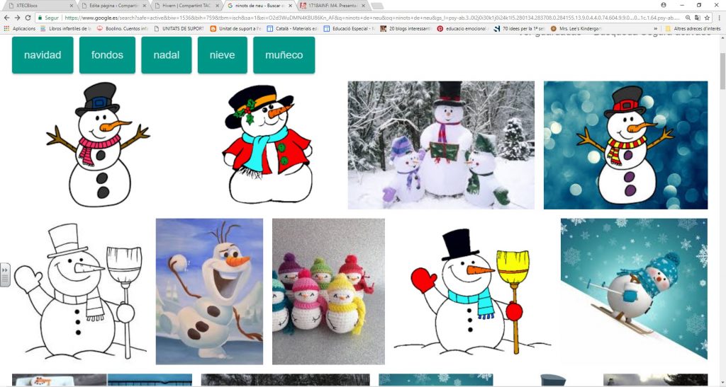1a sessió: L’activitat es farà amb tot el grup i consistirà en buscar per internet amb el Google imatges de ninots de neu. Primer pensarem com s’escriu ninot de neu i alguns nens aniran escrivint amb el teclat les lletres que li diuen els seus companys. Amb les imatges que apareguin la mestra farà un zoom per tal que només hi hagi sis o vuit imatges a la pantalla digital i amb aquestes imatges es jugarà al “Veig, veig” i d’aquest forma els alumnes coneixeran diferents tipus de ninots de neu.
