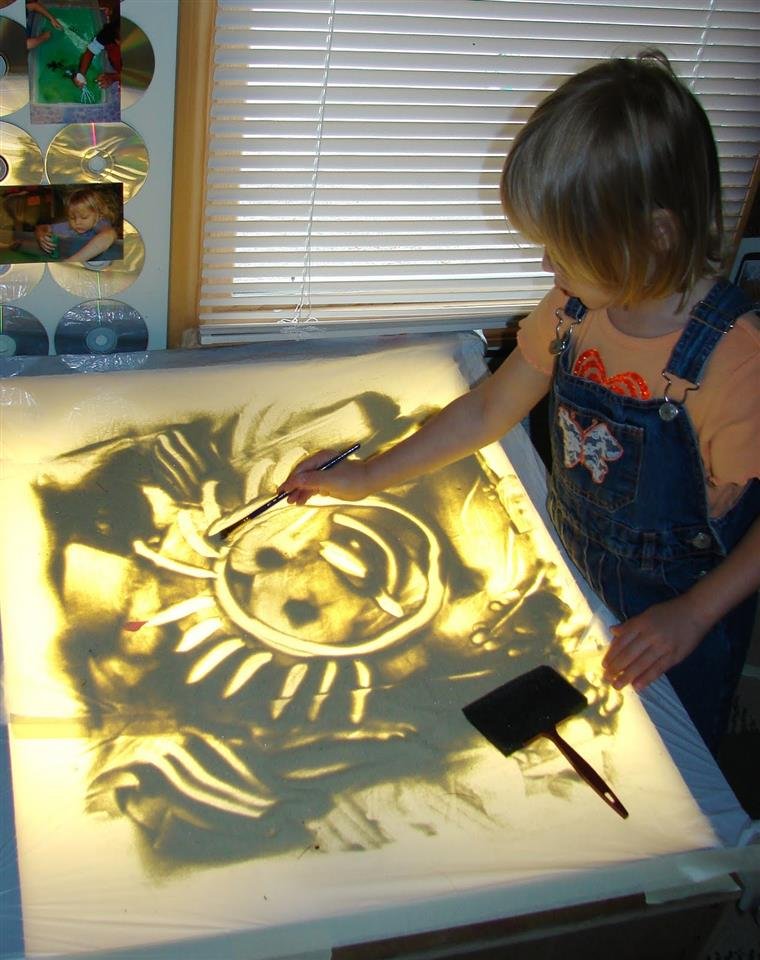 2a.sessió: Durant les sessions de racons de treball els alumnes individualment aniran dibuixant amb el dit un ninot de neu a la tauleta de llum. Es necessitarà una safata transparent amb sorra de color blau.