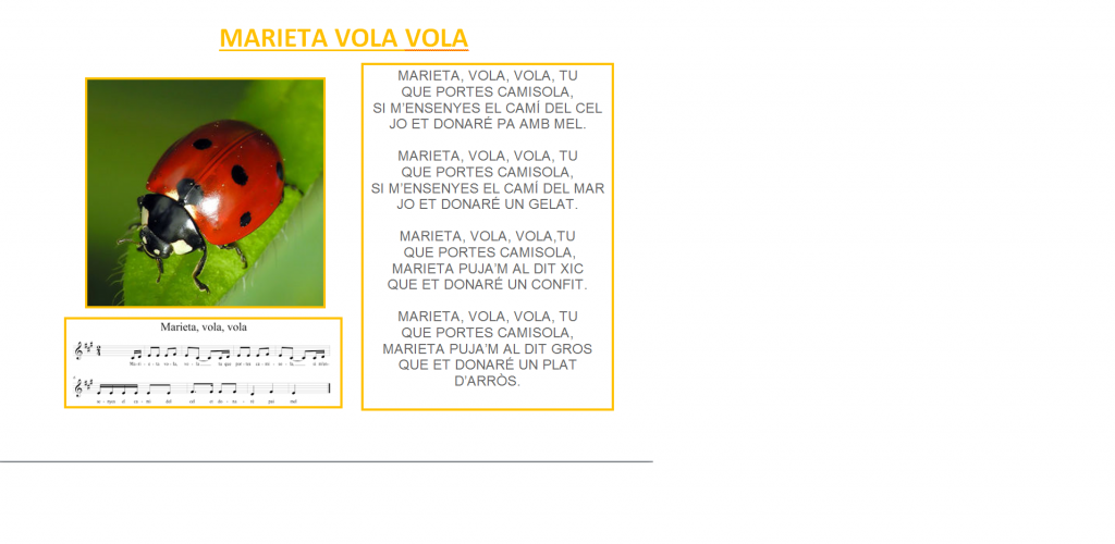 Els nens i nenes de P3 ens estem aprenent la cançó de Marieta vola vola, ena agrada moltíssim.