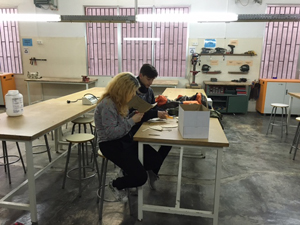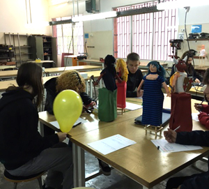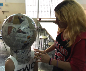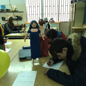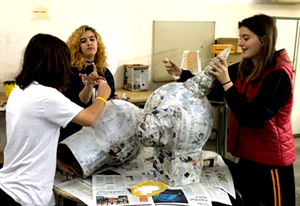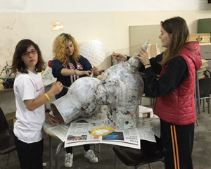 En Joan i la Noelia fent el nas i les orelles. La Marta posant cola al nas de la geganta.