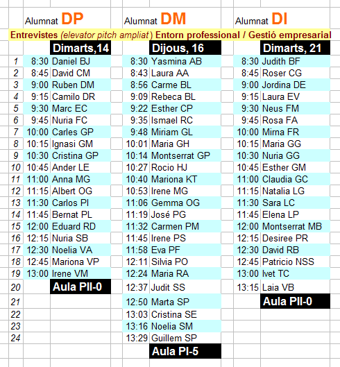 Clicant sobre la imatge veureu ampliades les hores aproximades per les entrevistes dels tres grups que faltaven per demà dimarts 14(DP), el dijous 16 (DM) i el dimarts 21 (DI).