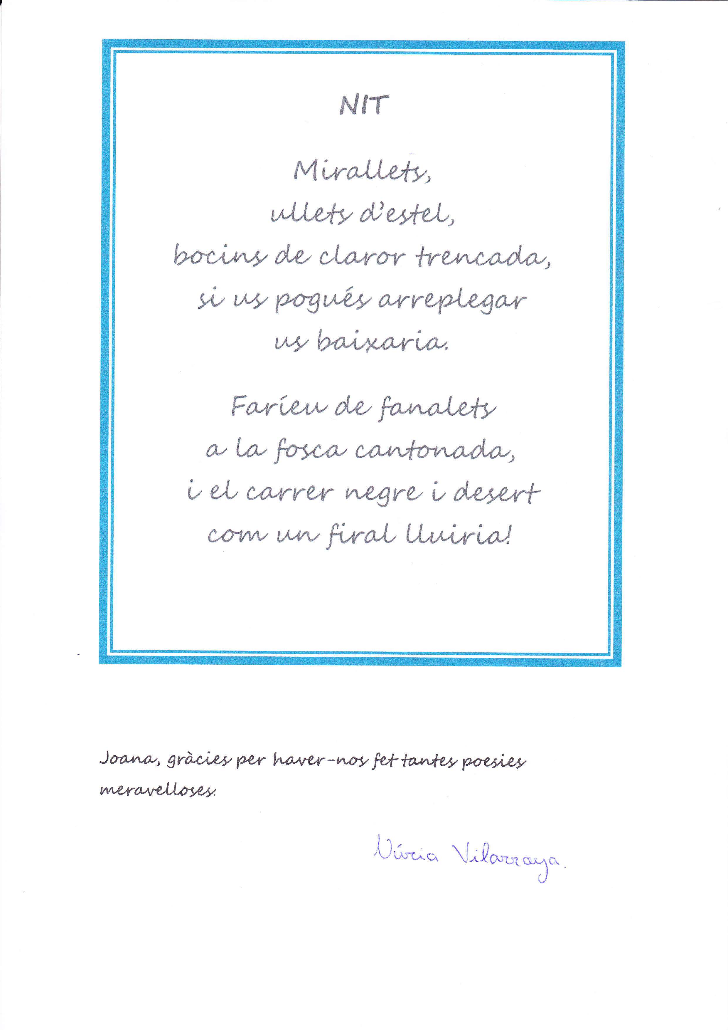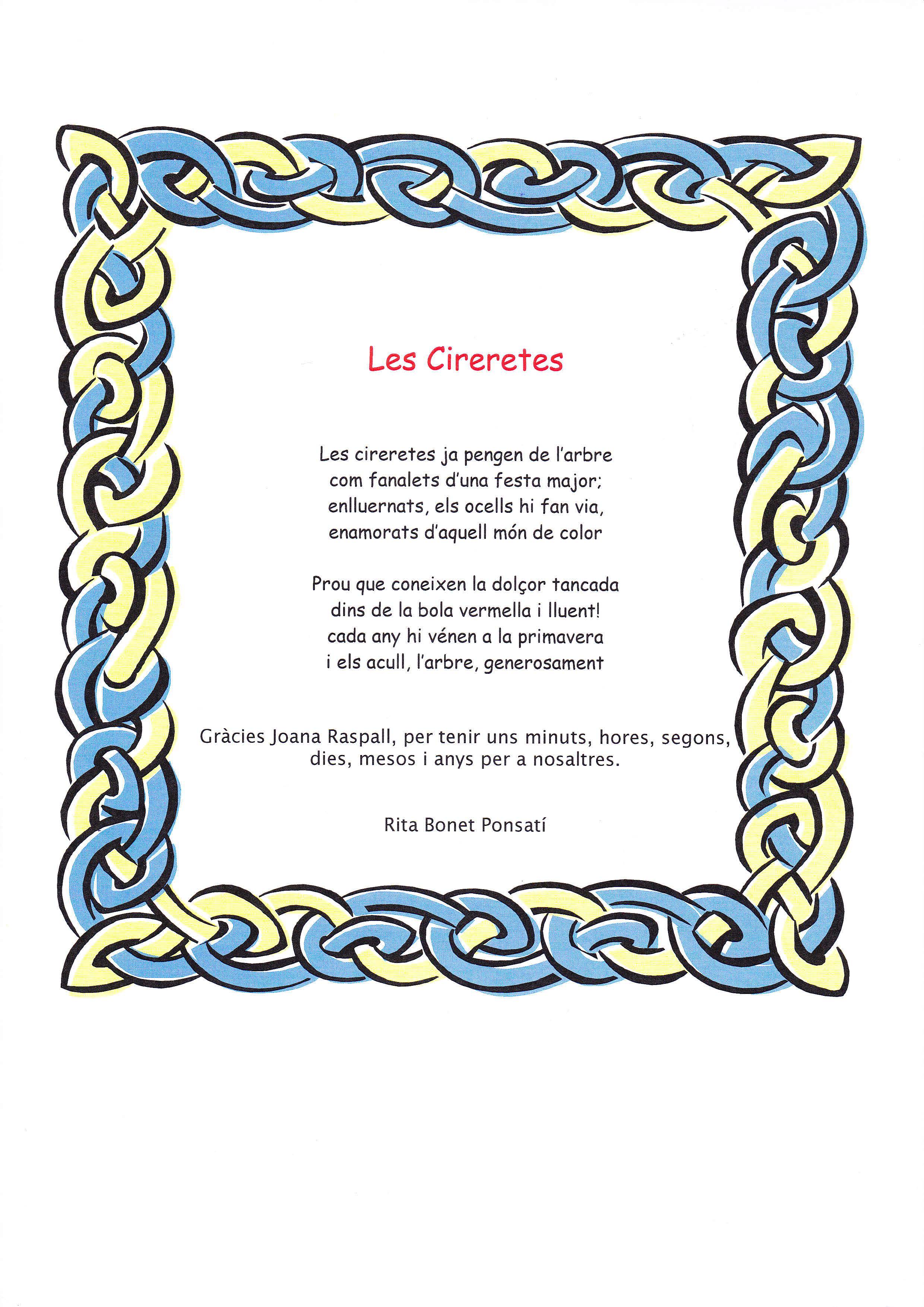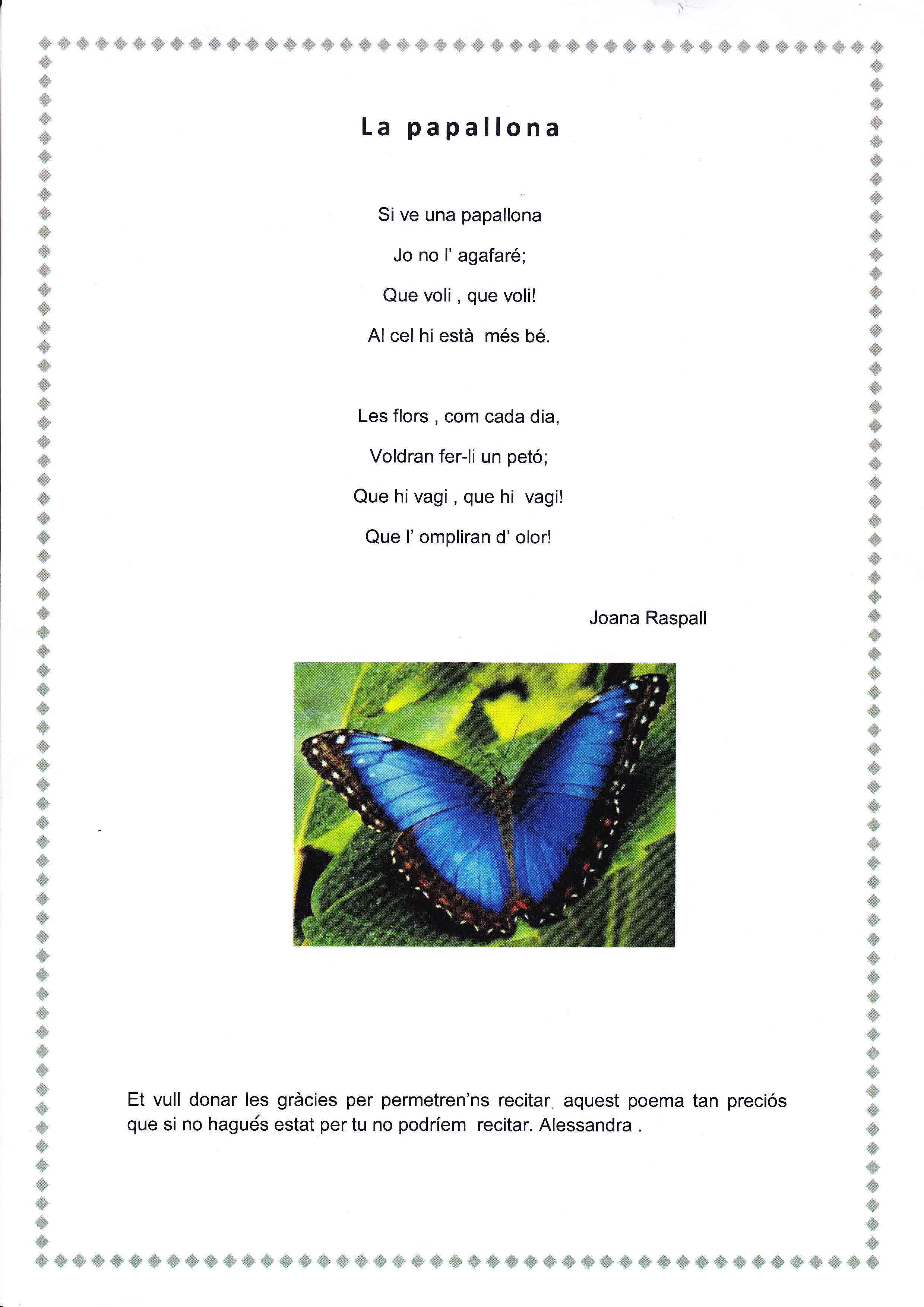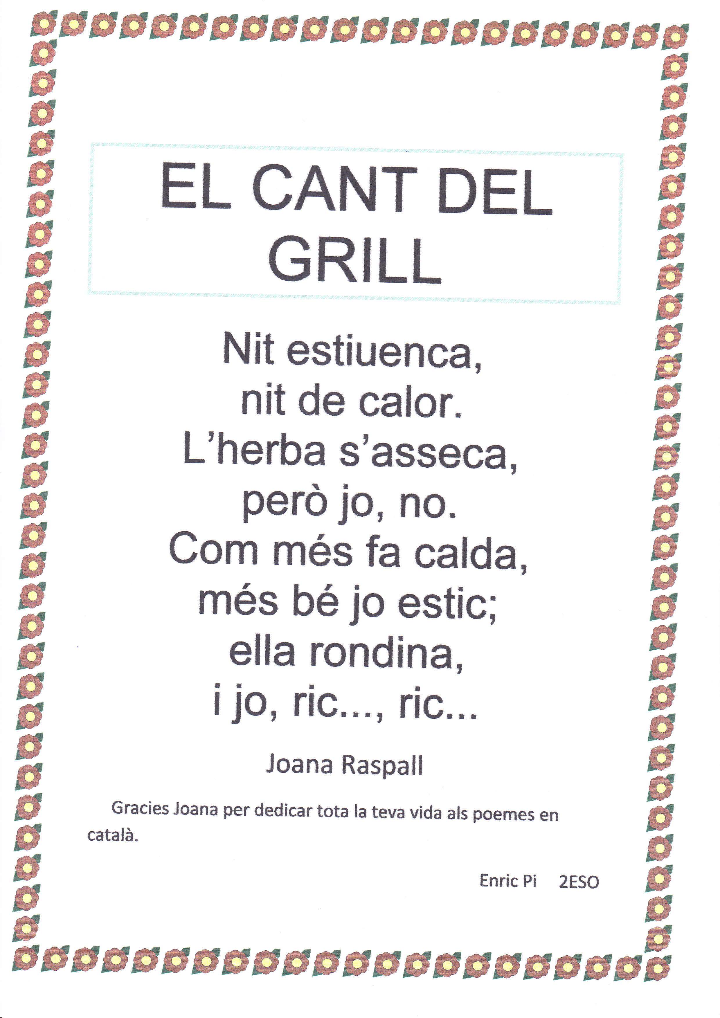 La classe de 2n d’ESO del Cor de Maria de la Bisbal d’Empordà hem decidit fer un petit homenatge a la poetessa Joana Raspall per agrair-li tots els poemes que ha escrit per a nosaltres.