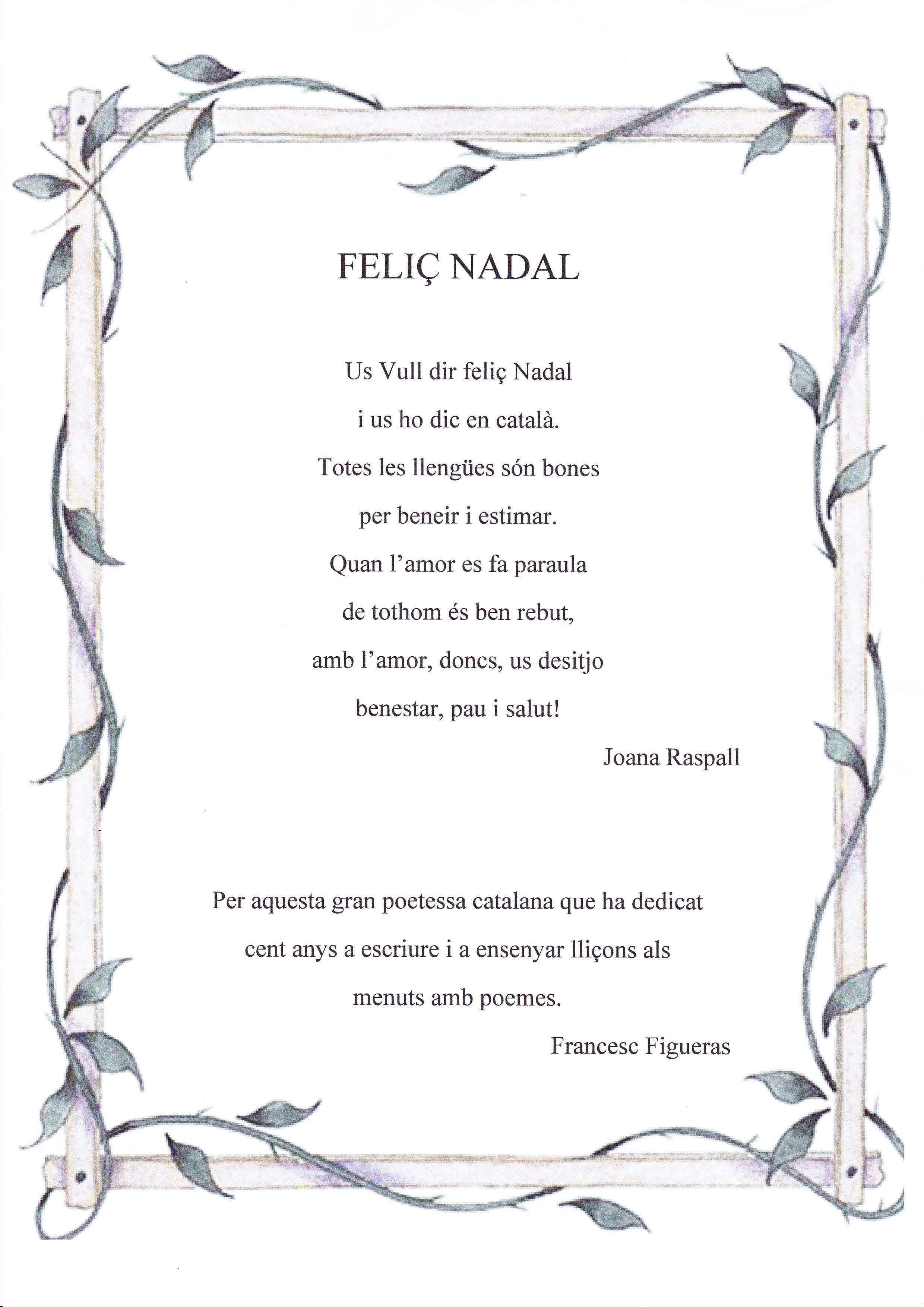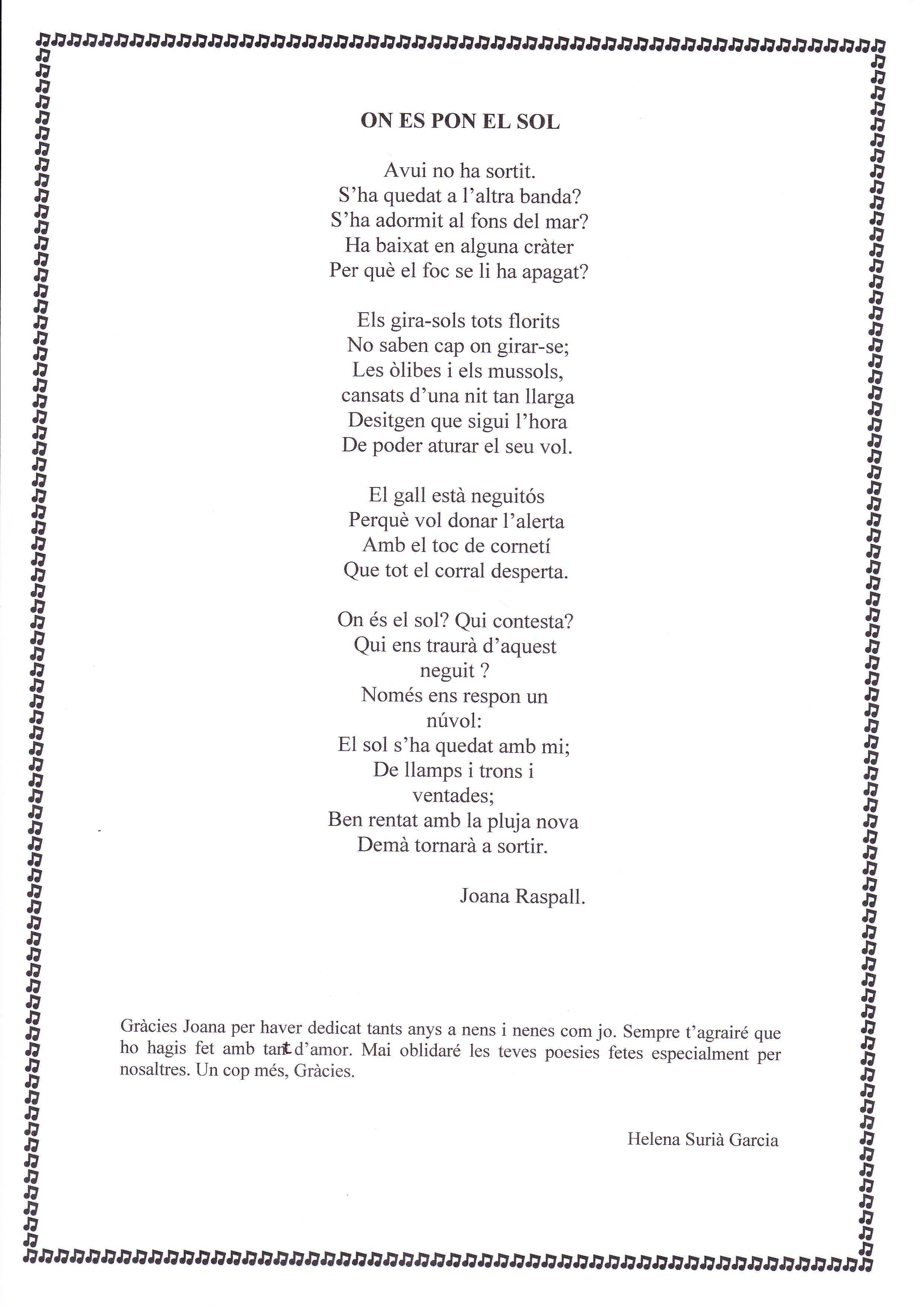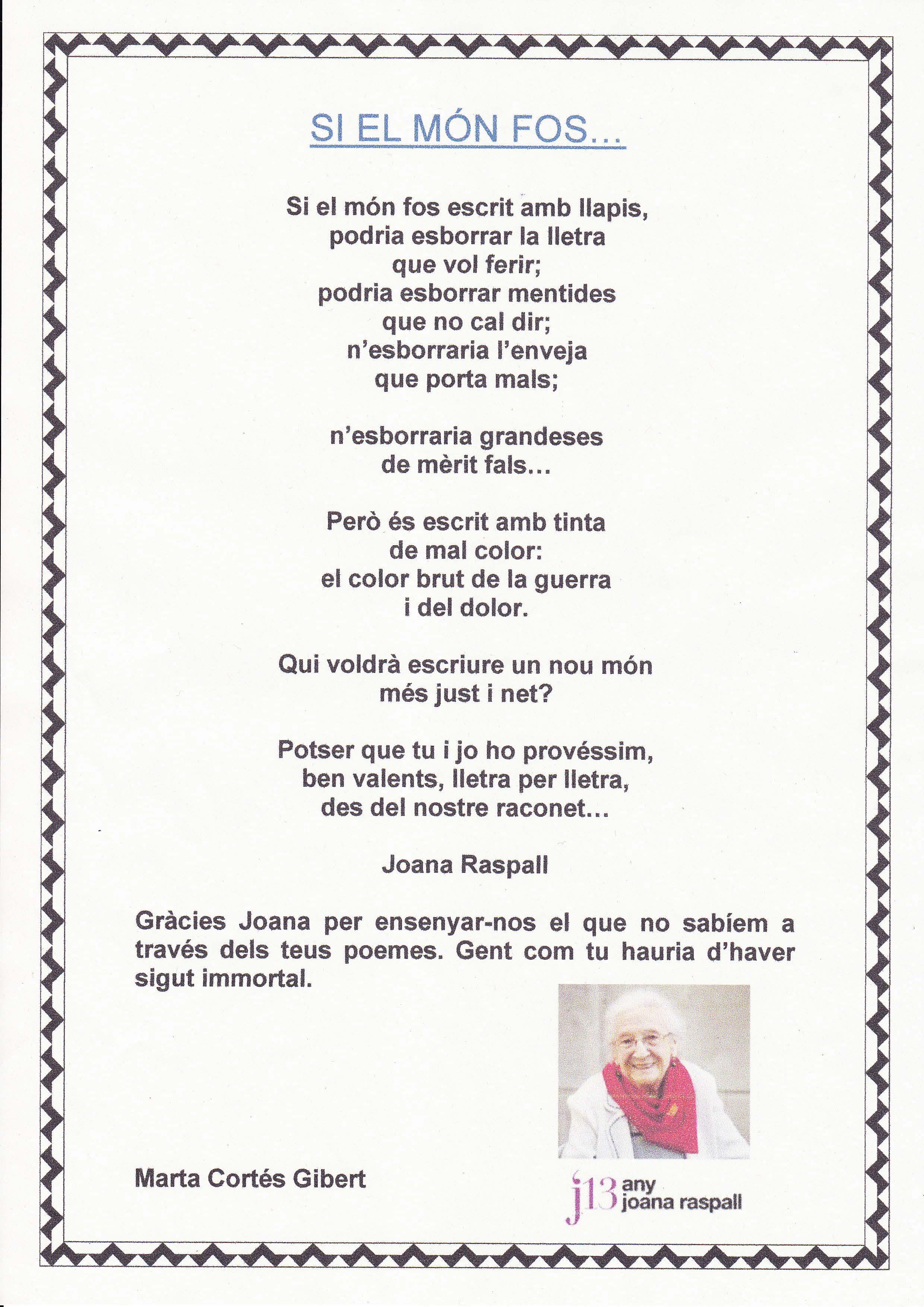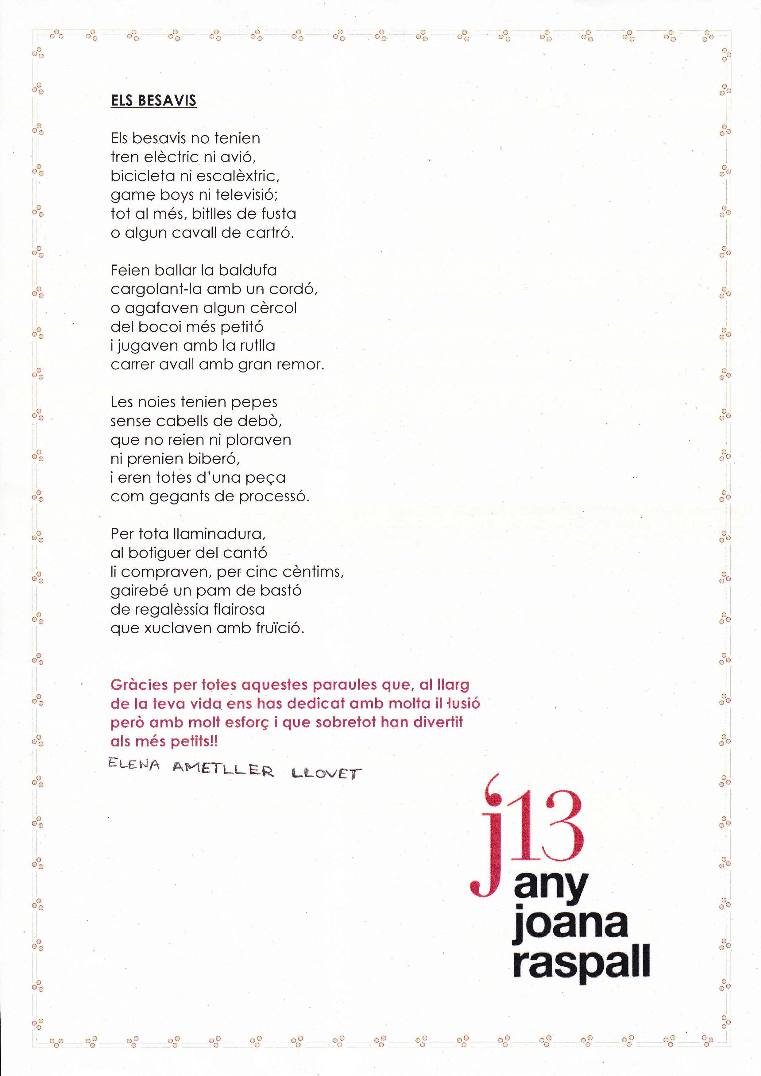 Joana Raspall ha mort als cent anys. Ella ha dedicat tota la vida a fer poemes per als nens i nenes del seu país. Ens ha deixat unes grans poesies que han omplert de felicitat i il•lusió la nostra infantesa.