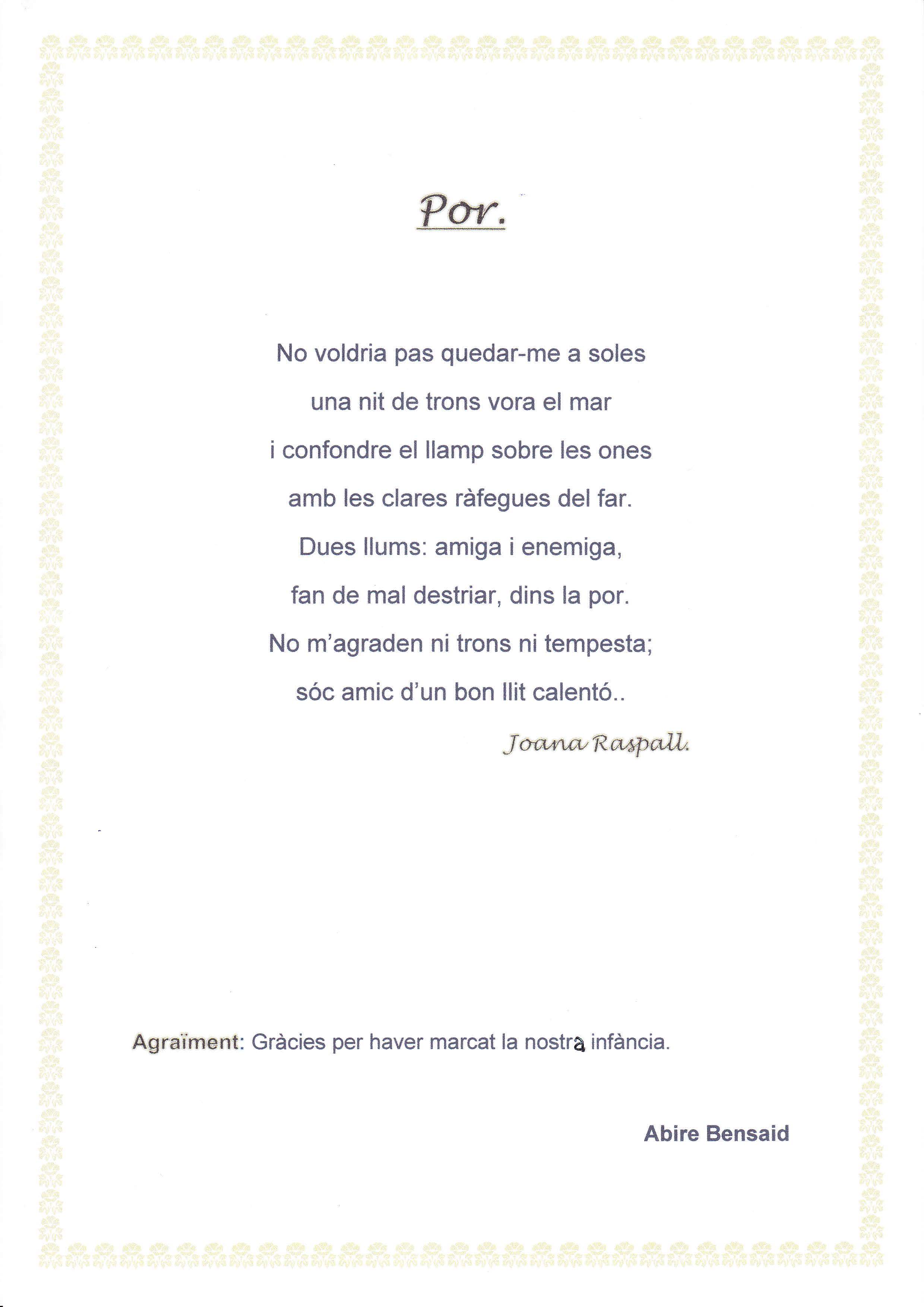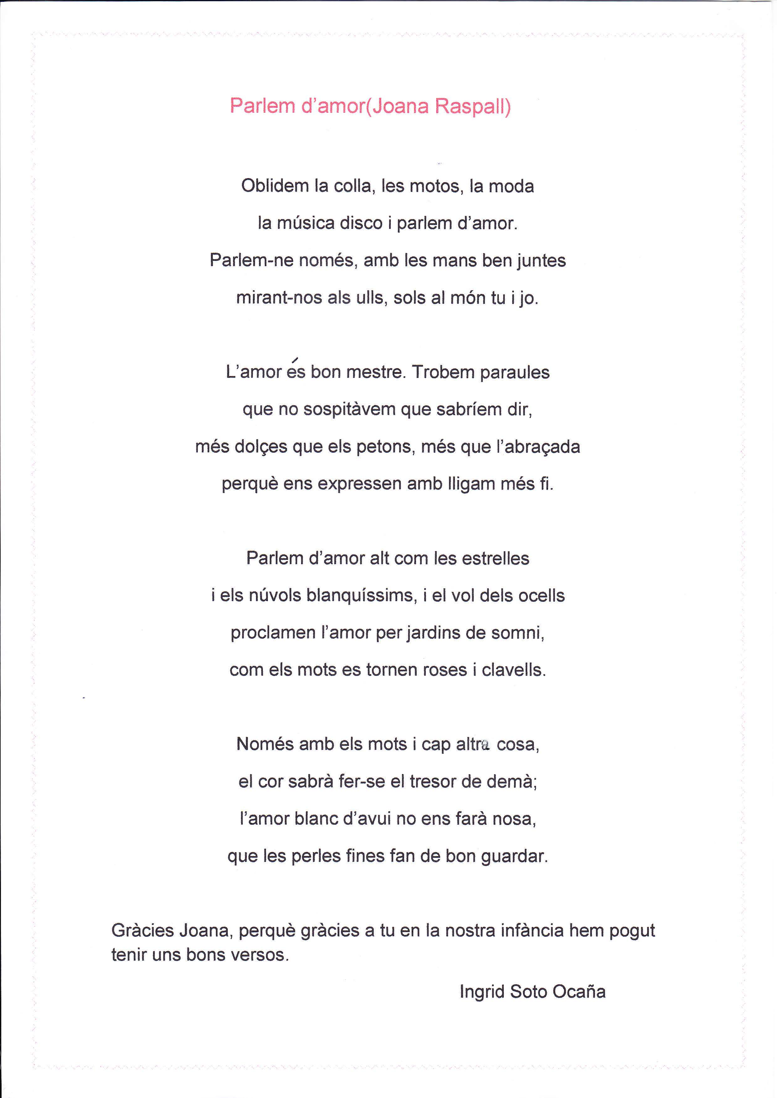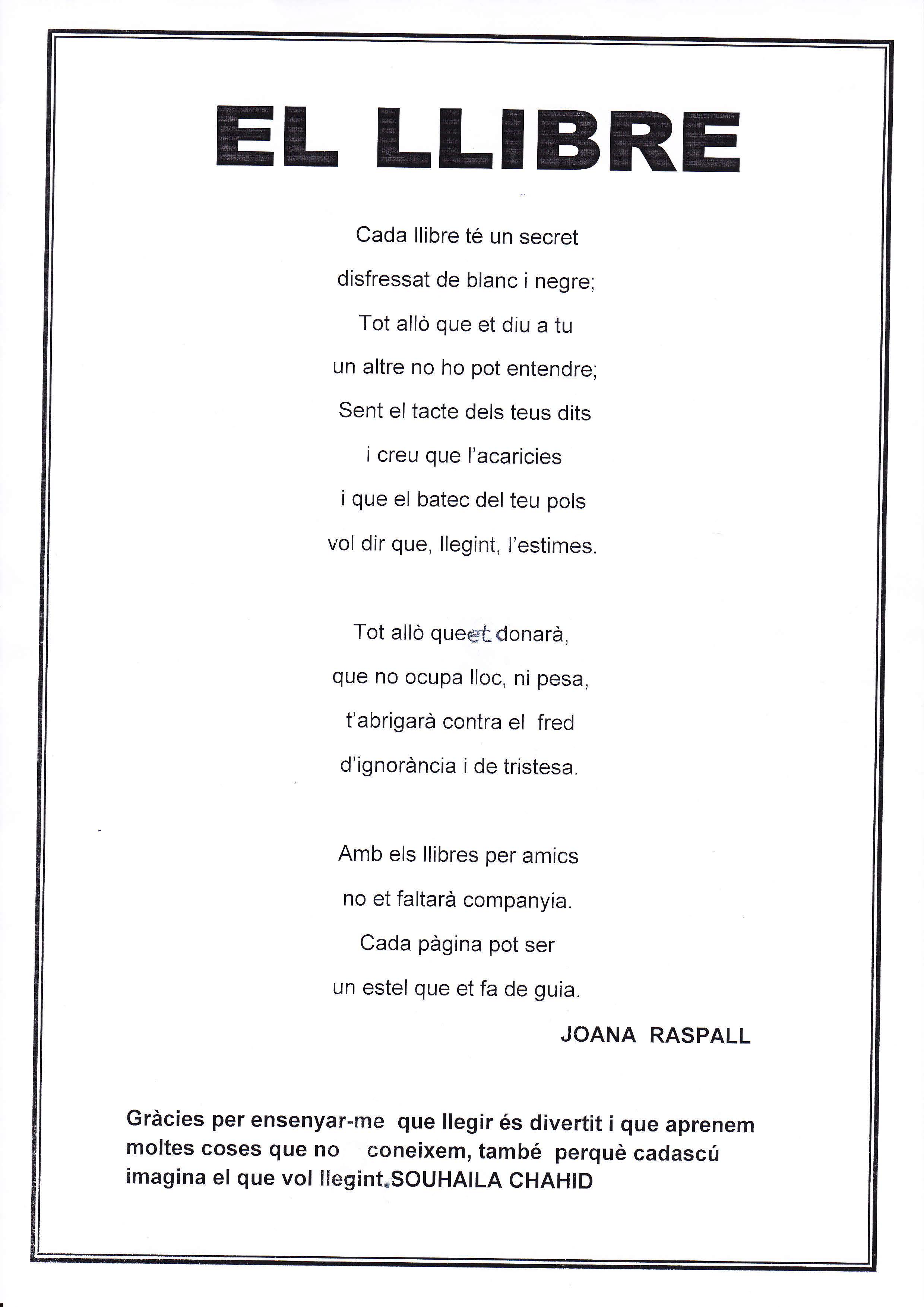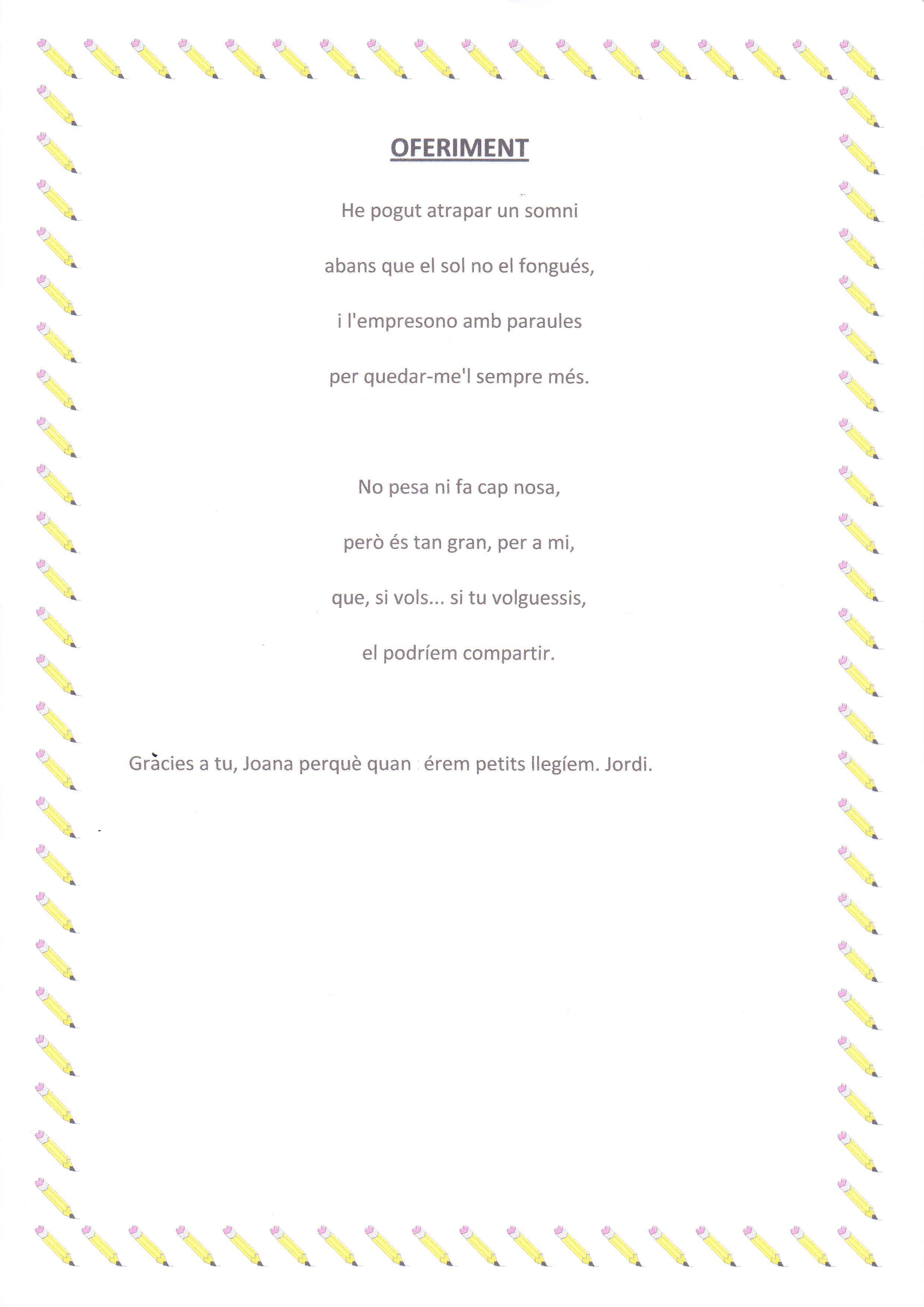 Nosaltres hem fet un recull dels poemes que ens han omplert més el cor i que ens han fet millors persones. La nostra intenció és que quan els llegiu us sentiu com ens hem sentit nosaltres. Desitgem que us agradin.