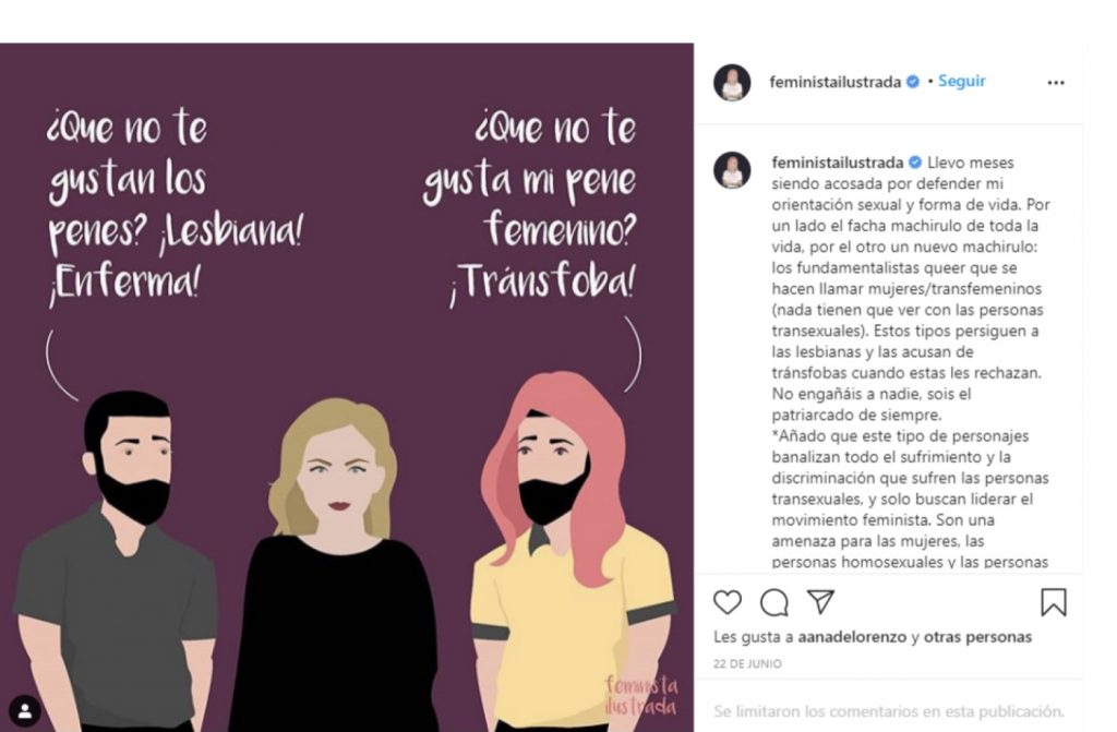 En aquest tipus de publicacions,, l’impacte no és sempre positiu per la societat perquè aquesta categoria de publicacions implica l’opinió personal o d’un col·lectiu que no sempre és la més positiva. Com a exemple, la següent imatge en la qual el compte @feministailustrada, fa una publicació trans-excloent. La trans-exclusió és un moviment de pensament derivat del feminisme que argumenta que les dones trans no poden pertànyer a la lluita feminista per no ser dones biològiques. Aquest moviment també entra dins de les publicacions d’acció social tot i estar en contra de la llibertat de les dones trans. Aquestes publicacions són accions socials encara que no vetllin per tots drets humans.