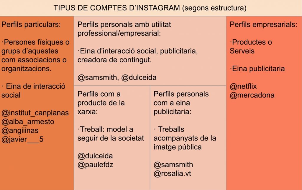 Aquesta seria més o menys la classificació referent a la manera de gestionar-se un perfil, al seu objectiu, a la seva estructura, però el que ens interessa i volem estudiar pel nostre treball és el contingut d’aquests comptes.