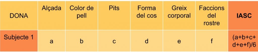 Per començar, hem realitzat dues taules amb criteris lleugerament diferents pels dos sexes. Només tenit en compte la morfologia biològica, i no pel gènere amb el qual s’identifica la persona. Per exemple, un dels criteris de les dones són els pits, però en els homes l’hem substituït per l’abdomen, cada sexe s’avalua per aquelles parts del cos que tenen els cànons imposats més fortament.