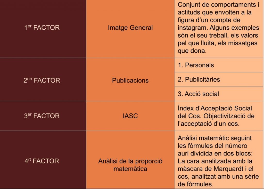 Referent al tercer factor, l’Índex d’acceptació social del cos, trobarem un IASC menys alt que els influencers normatius, tot i que serà prou alt, fet que els fa estar acceptats. Pel que fa al quart factor, esperem trobar una similitud entre els influencers i el que dicta la proporció àuria, però no tan exacta com la dels influencers normatius.
