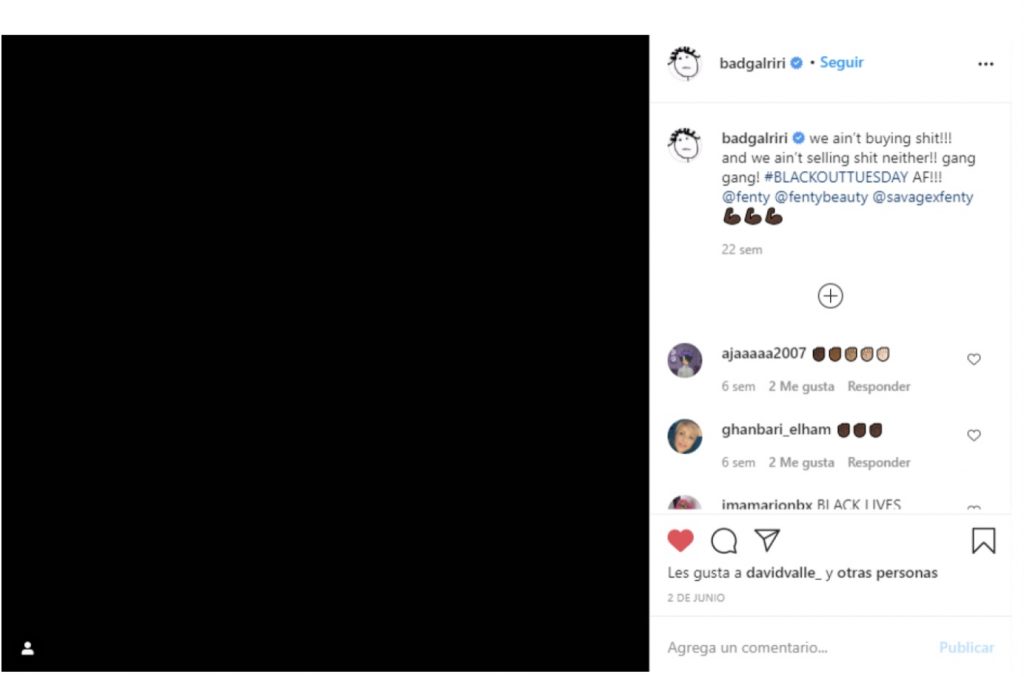 En aquesta publicació la cantant barbadiana, Rihanna, defensa el moviment contra la discriminació de les persones negres, Black Lives Matter que va tenir una de les seves onades més importants el maig del 2020.