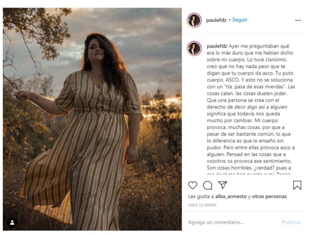 En la imatge es veu una publicació de l’influencer Paule Fernandez acompanyada d’un text en el qual reflexiona sobre la discriminació corporal en contraposició a l’orgull que té ella de ser com és.