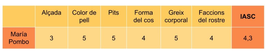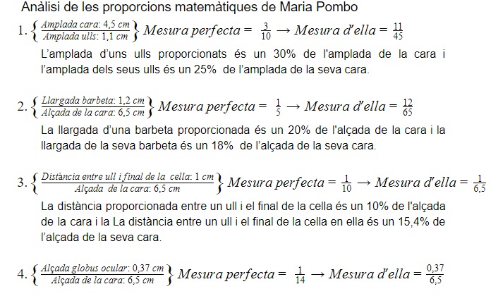 María Pombo, segueix la proporció matemàtica aplicada a la bellesa amb bastant precisió, encaixant bé amb la màscara de marquardt, no superant un 5% de diferència amb els percentatges d’ampliació i apropant-se al número auri en l’equació del cos perfecte.