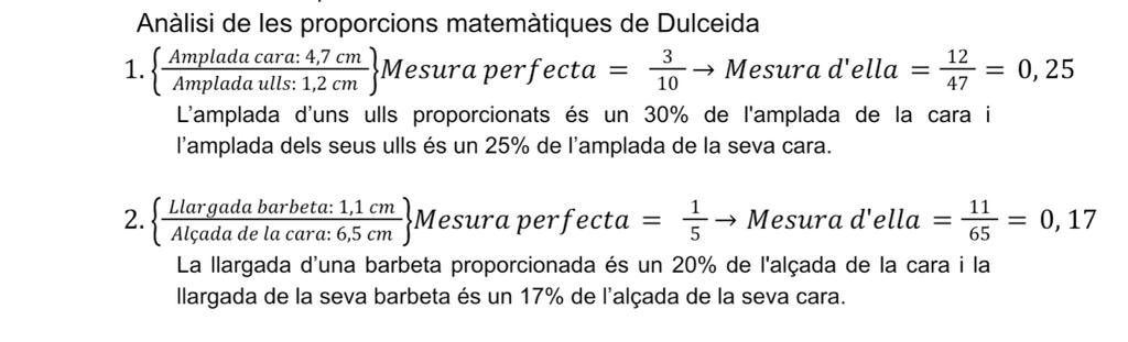 Aquest resultat demostra que físicament, Dulceida s’apropa bastant a la xifra de la Proporció Àuria, el que dicta que el seu cos segueix matemàticament una harmonia i una perfecció respecte a la bellesa matemàticament establerta.
